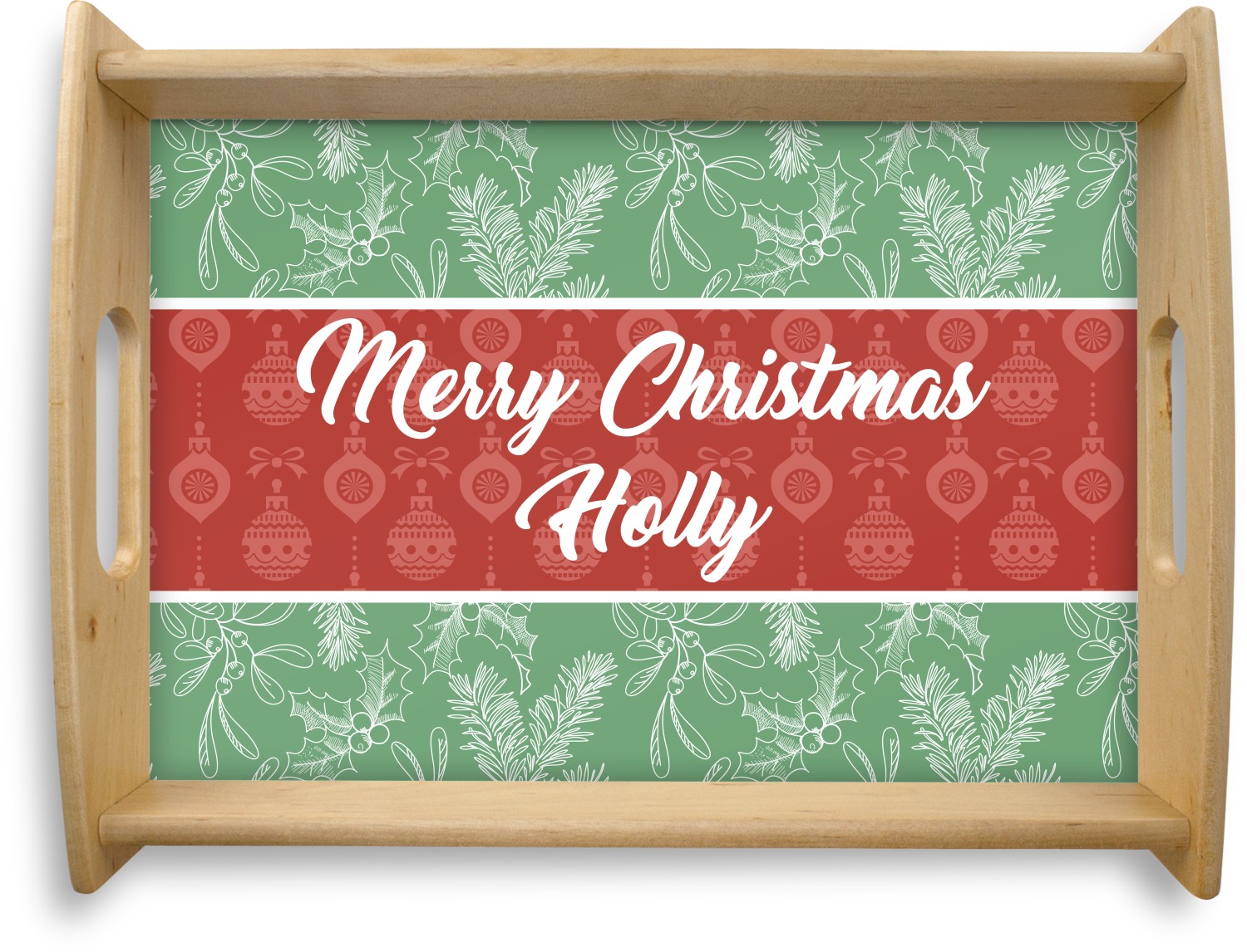The design is divided into three horizontal parts. The top and bottom are a beautiful green holly background and the middle has a subtle red ornaments background. The middle section is where your personalization goes. This is a great design idea for Christmas decor or Christmas gifts.