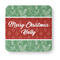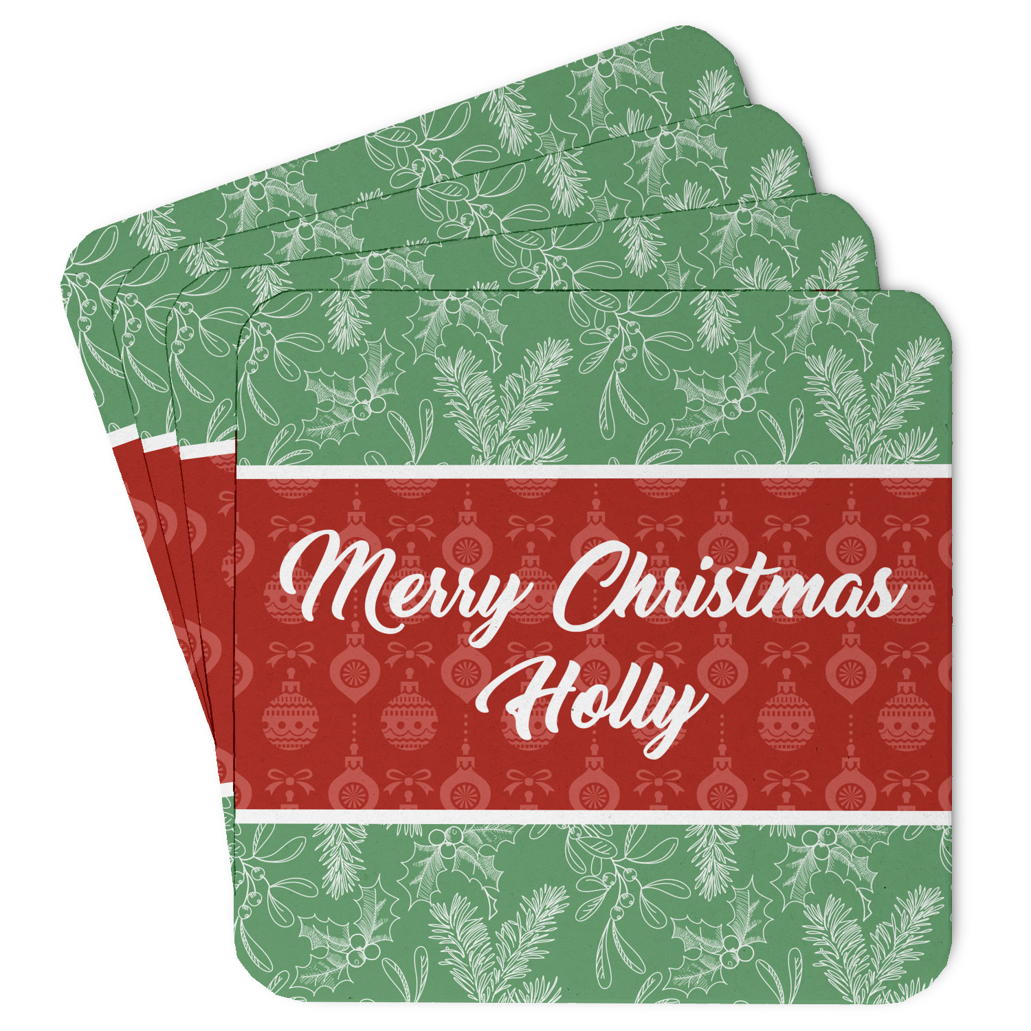 The design is divided into three horizontal parts. The top and bottom are a beautiful green holly background and the middle has a subtle red ornaments background. The middle section is where your personalization goes. This is a great design idea for Christmas decor or Christmas gifts.
