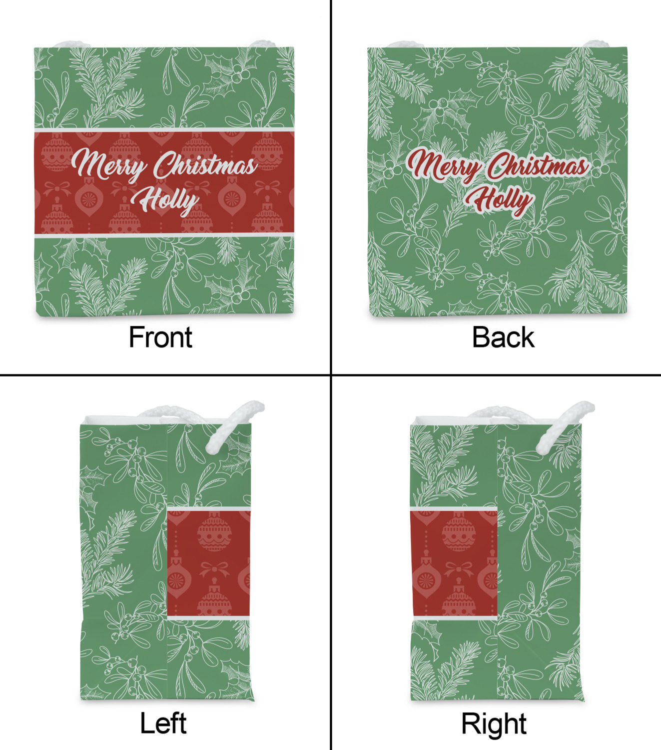 The design is divided into three horizontal parts. The top and bottom are a beautiful green holly background and the middle has a subtle red ornaments background. The middle section is where your personalization goes. This is a great design idea for Christmas decor or Christmas gifts.