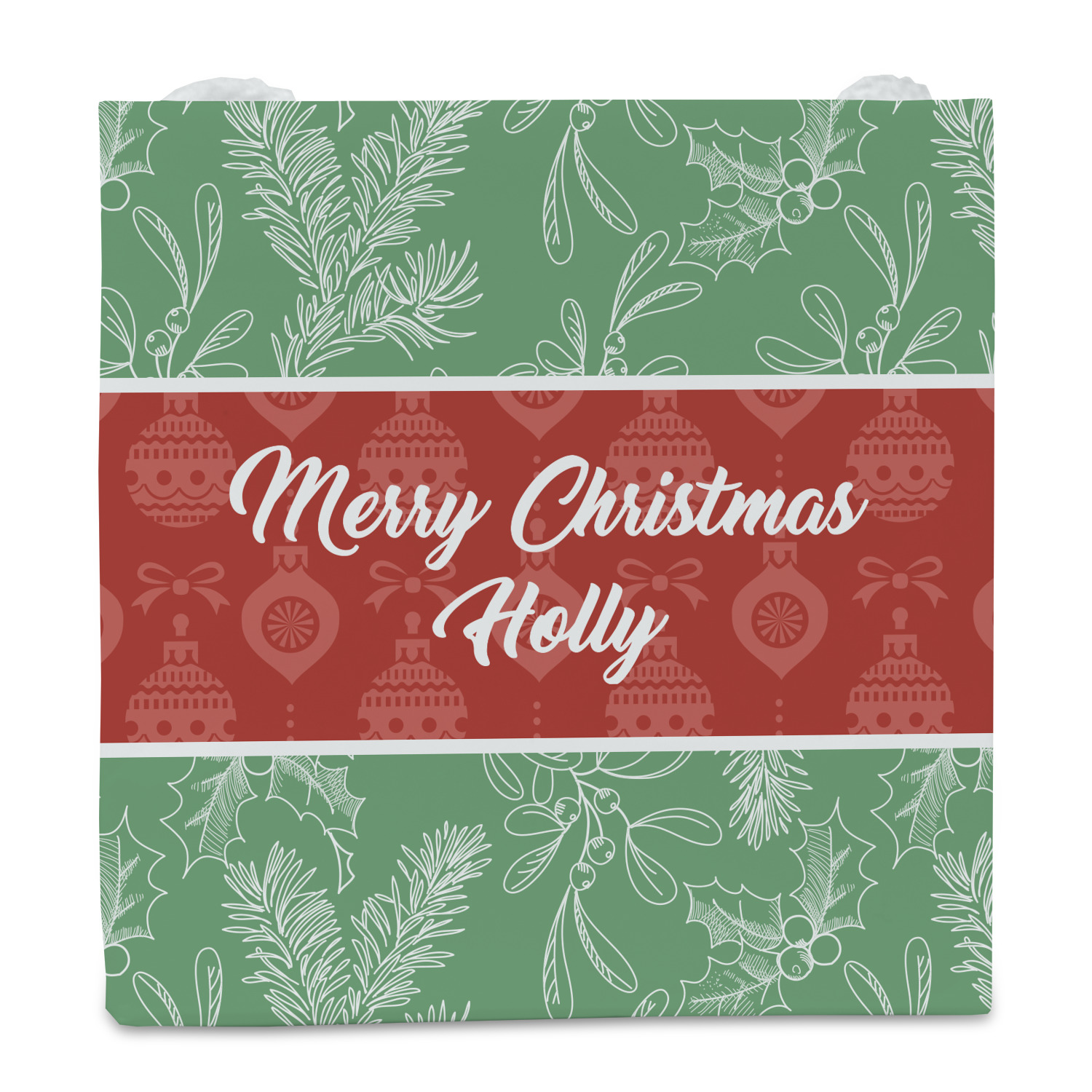The design is divided into three horizontal parts. The top and bottom are a beautiful green holly background and the middle has a subtle red ornaments background. The middle section is where your personalization goes. This is a great design idea for Christmas decor or Christmas gifts.