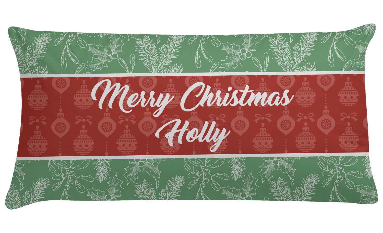 The design is divided into three horizontal parts. The top and bottom are a beautiful green holly background and the middle has a subtle red ornaments background. The middle section is where your personalization goes. This is a great design idea for Christmas decor or Christmas gifts.