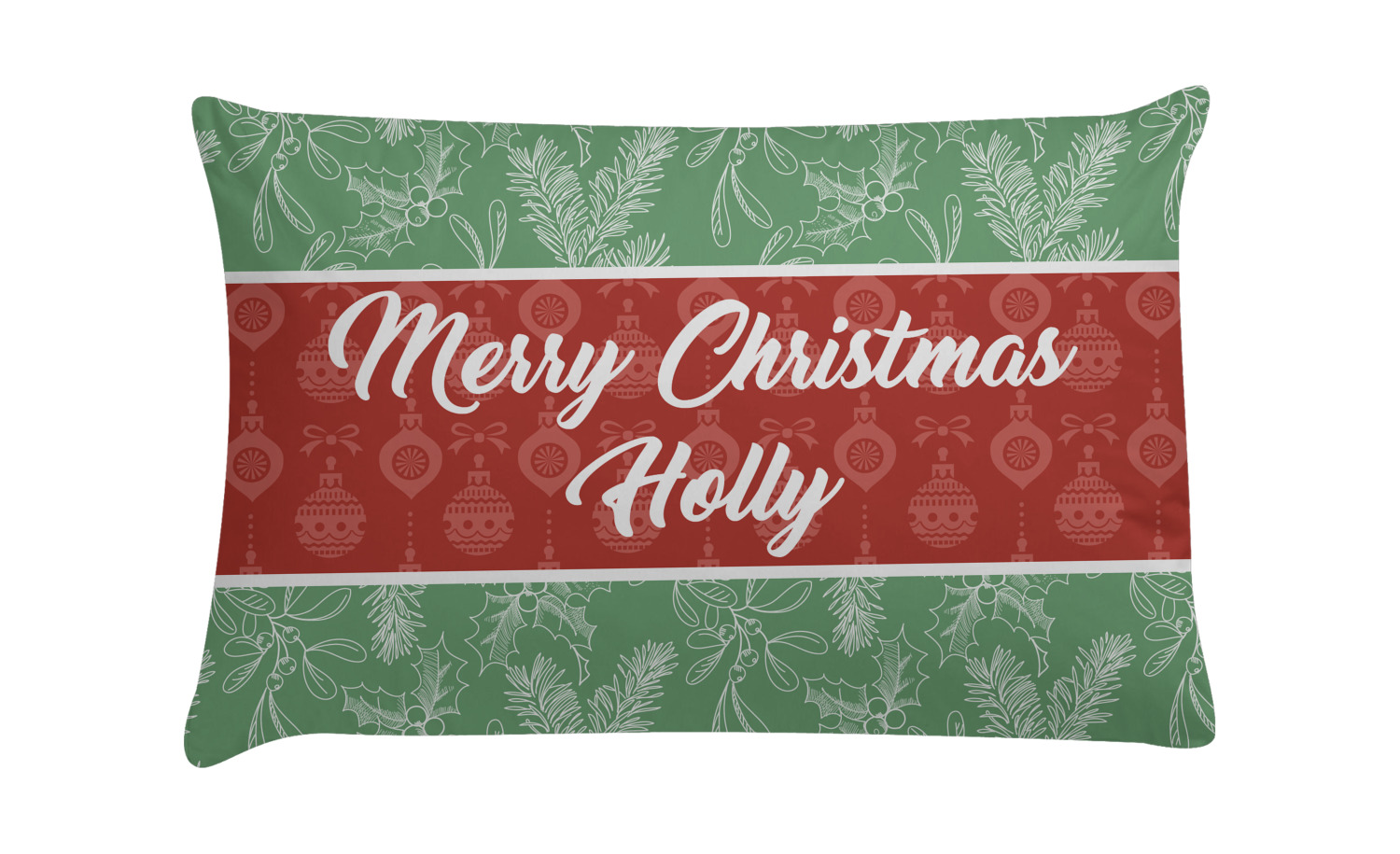 The design is divided into three horizontal parts. The top and bottom are a beautiful green holly background and the middle has a subtle red ornaments background. The middle section is where your personalization goes. This is a great design idea for Christmas decor or Christmas gifts.
