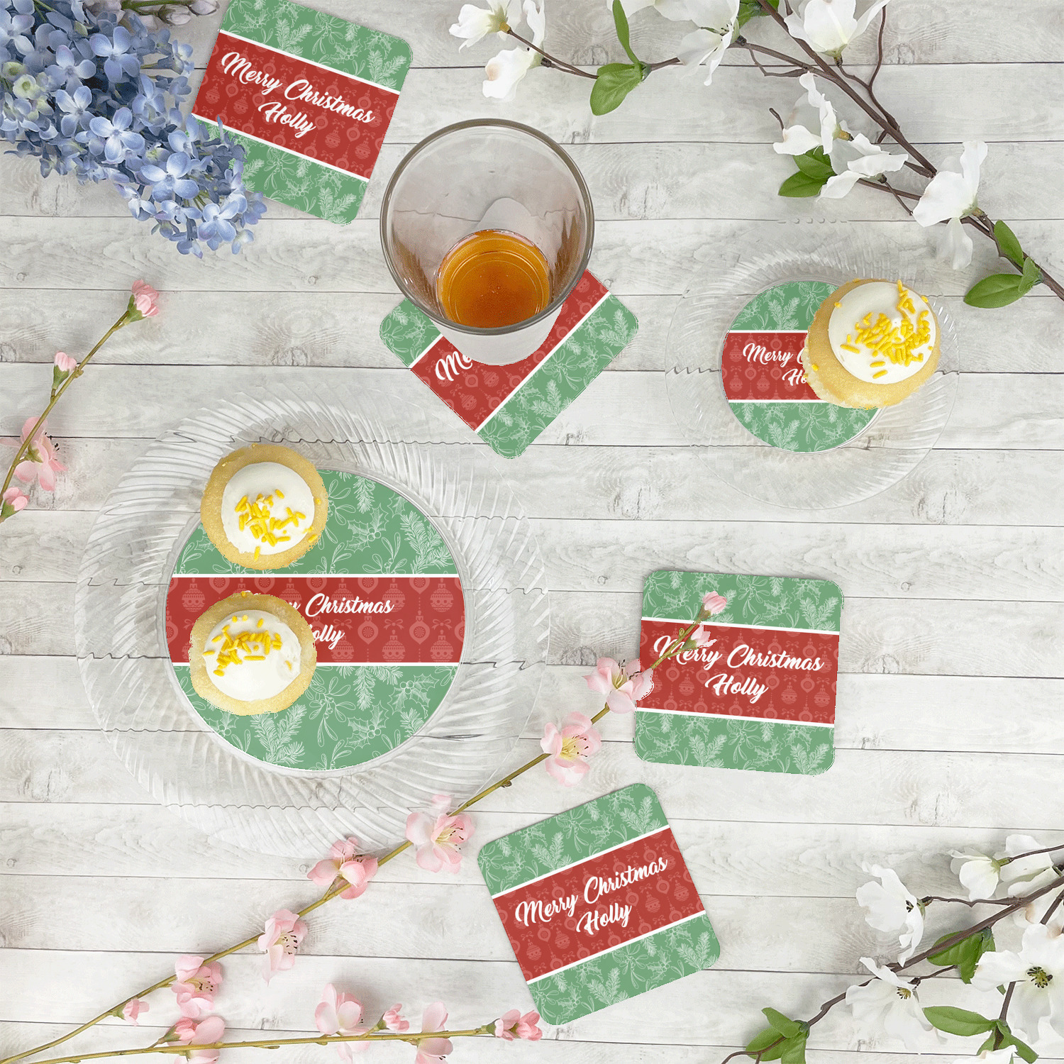 The design is divided into three horizontal parts. The top and bottom are a beautiful green holly background and the middle has a subtle red ornaments background. The middle section is where your personalization goes. This is a great design idea for Christmas decor or Christmas gifts.