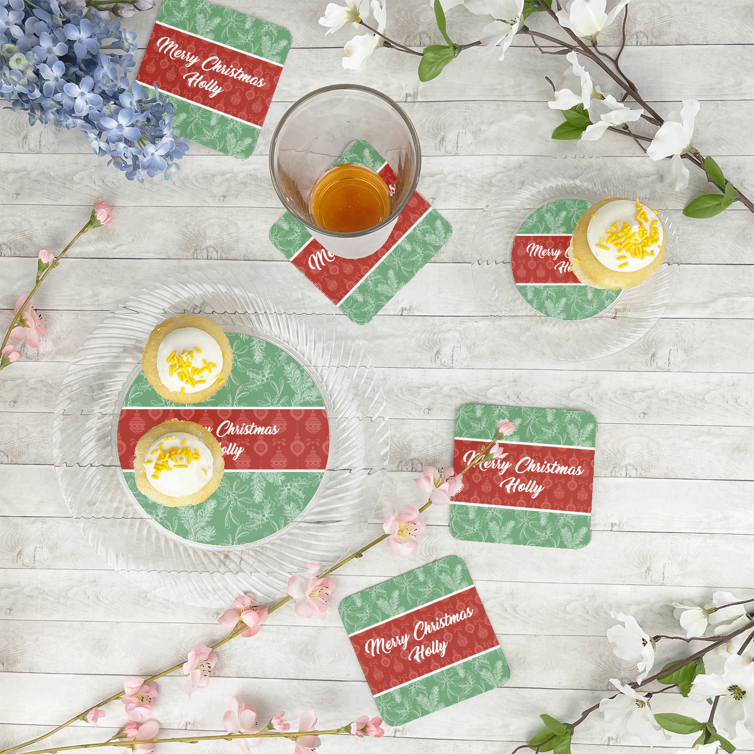 The design is divided into three horizontal parts. The top and bottom are a beautiful green holly background and the middle has a subtle red ornaments background. The middle section is where your personalization goes. This is a great design idea for Christmas decor or Christmas gifts.
