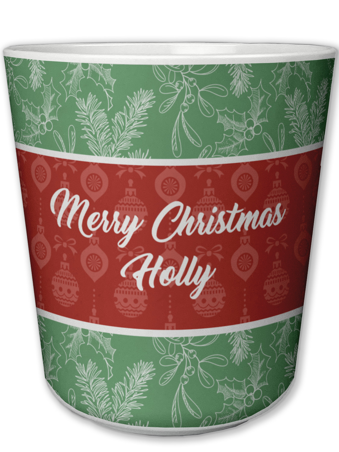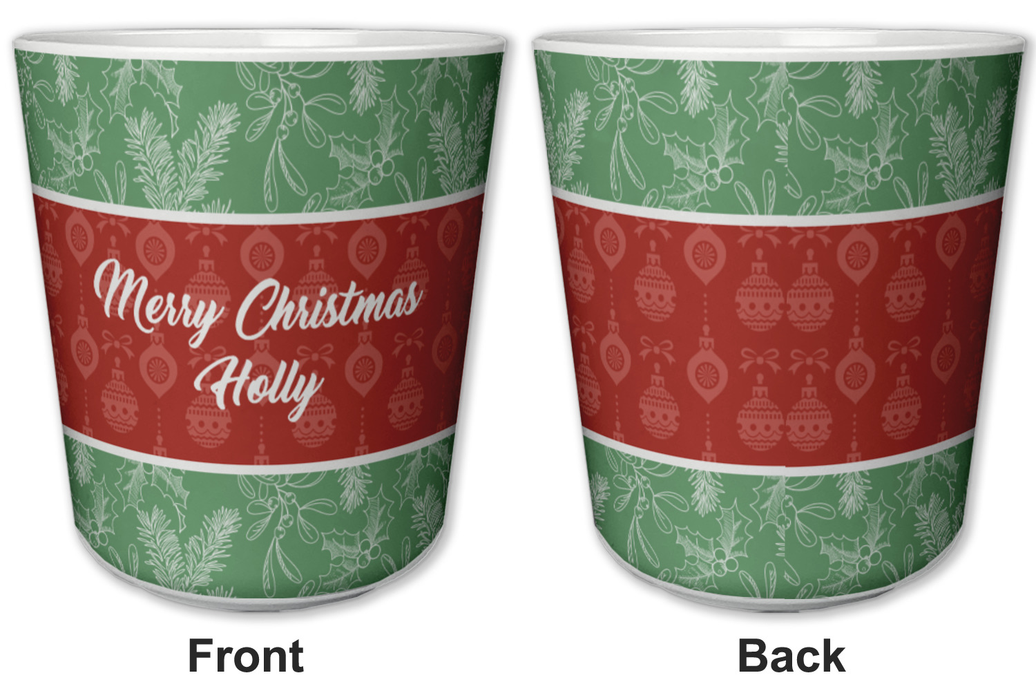 The design is divided into three horizontal parts. The top and bottom are a beautiful green holly background and the middle has a subtle red ornaments background. The middle section is where your personalization goes. This is a great design idea for Christmas decor or Christmas gifts.
