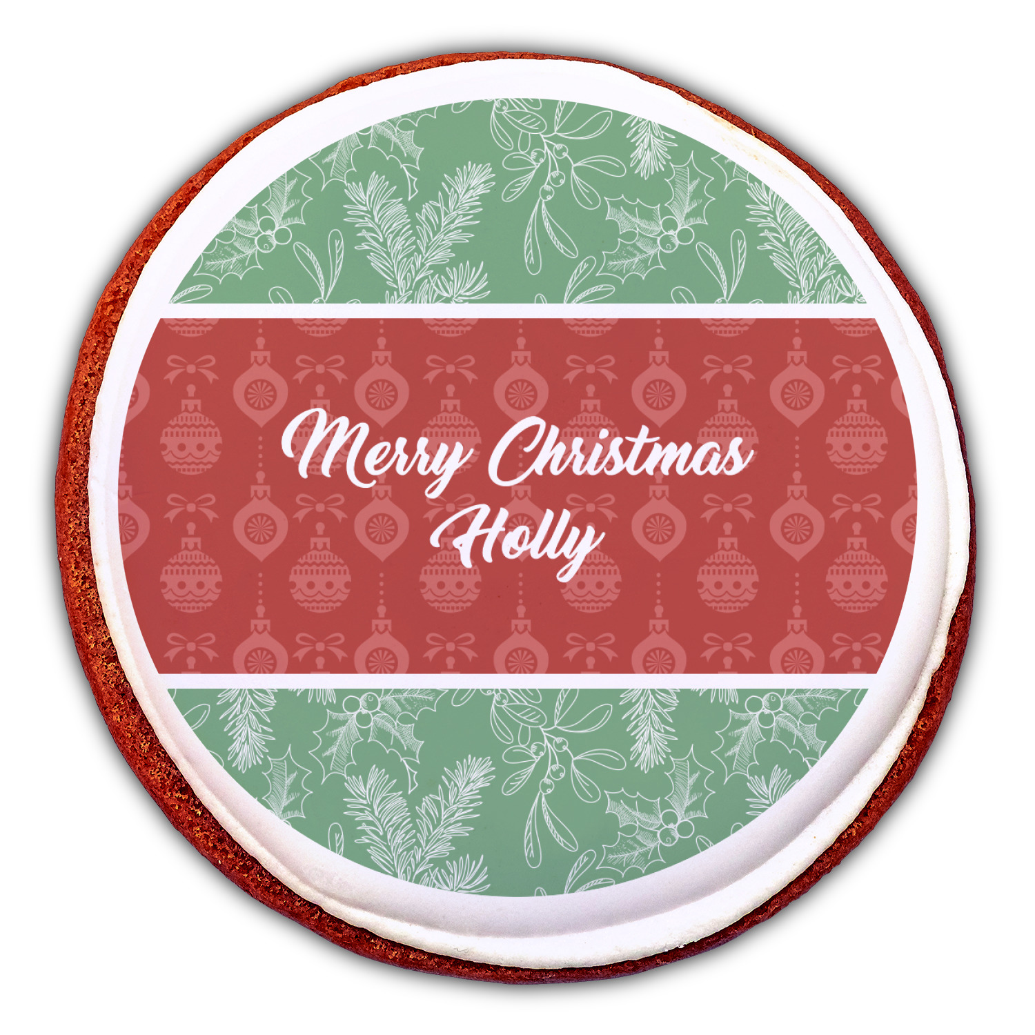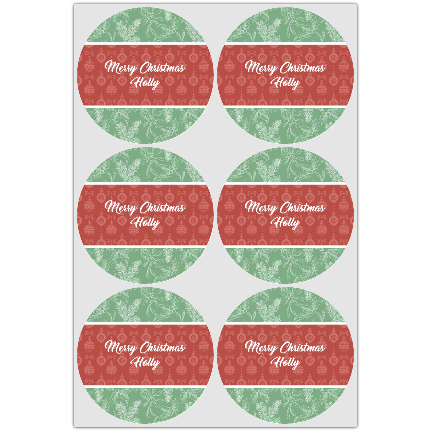 The design is divided into three horizontal parts. The top and bottom are a beautiful green holly background and the middle has a subtle red ornaments background. The middle section is where your personalization goes. This is a great design idea for Christmas decor or Christmas gifts.