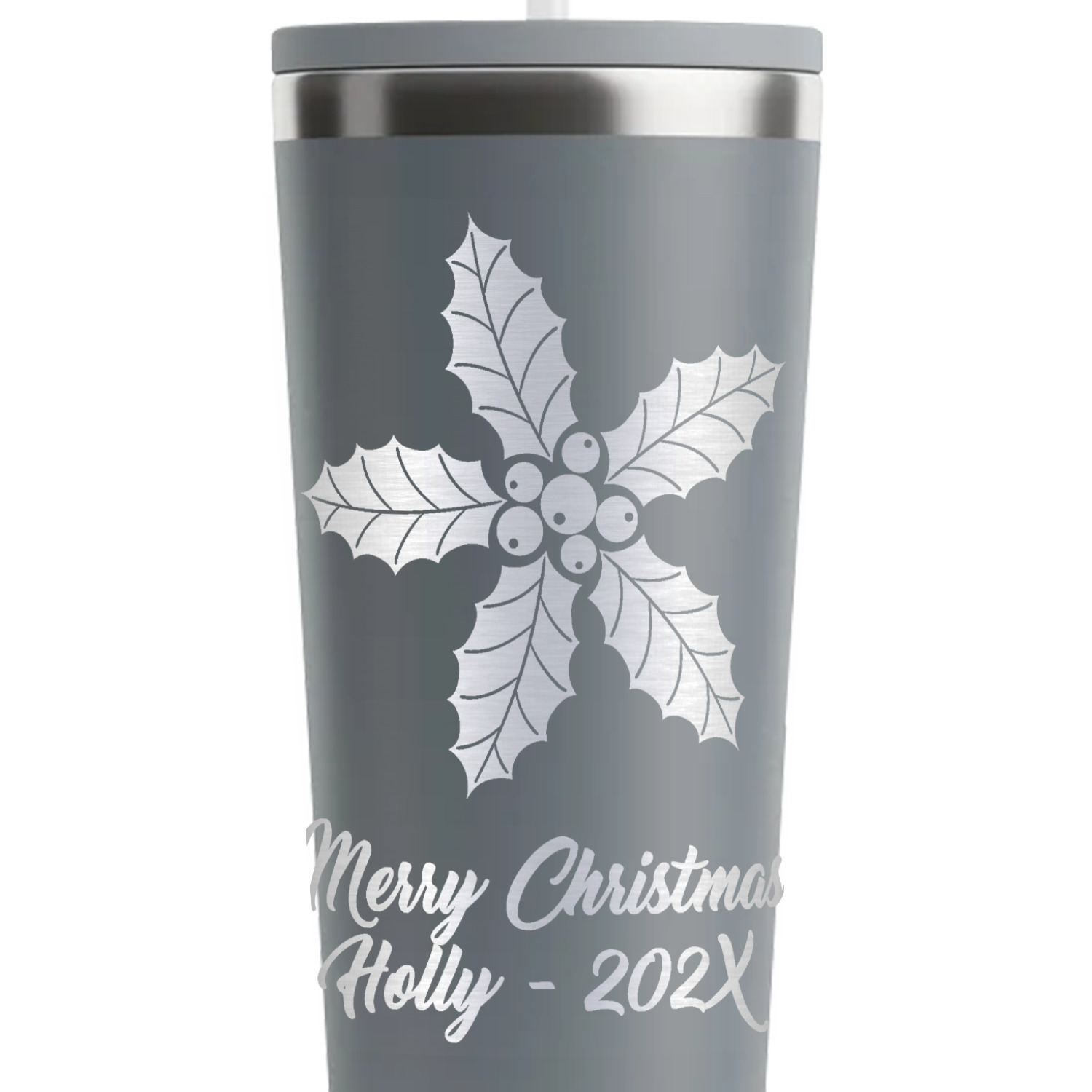 The design is divided into three horizontal parts. The top and bottom are a beautiful green holly background and the middle has a subtle red ornaments background. The middle section is where your personalization goes. This is a great design idea for Christmas decor or Christmas gifts.