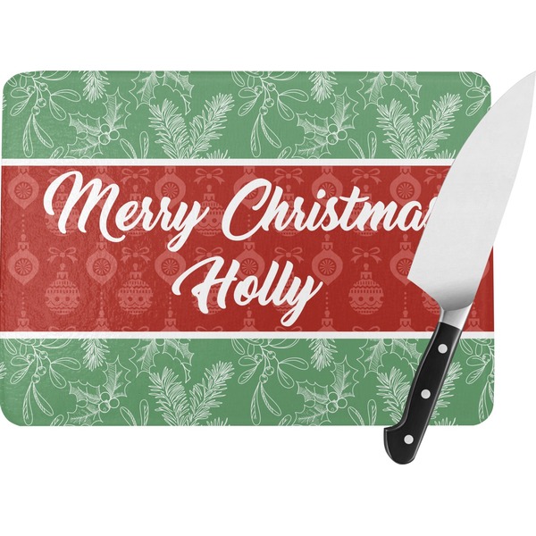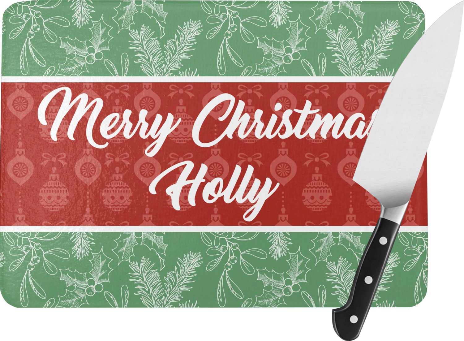 The design is divided into three horizontal parts. The top and bottom are a beautiful green holly background and the middle has a subtle red ornaments background. The middle section is where your personalization goes. This is a great design idea for Christmas decor or Christmas gifts.