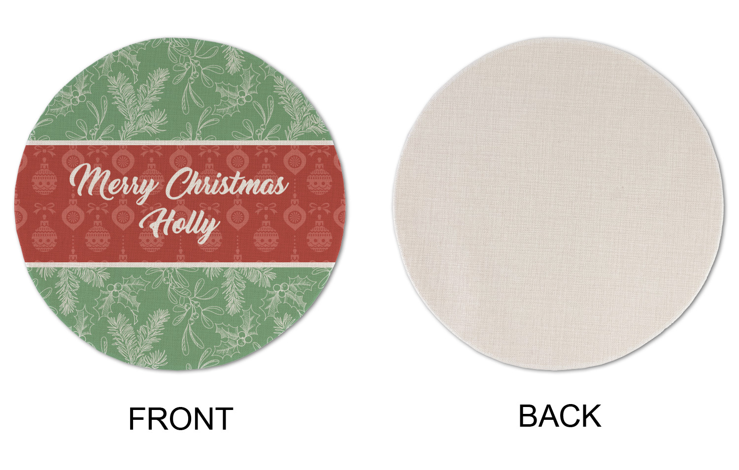The design is divided into three horizontal parts. The top and bottom are a beautiful green holly background and the middle has a subtle red ornaments background. The middle section is where your personalization goes. This is a great design idea for Christmas decor or Christmas gifts.