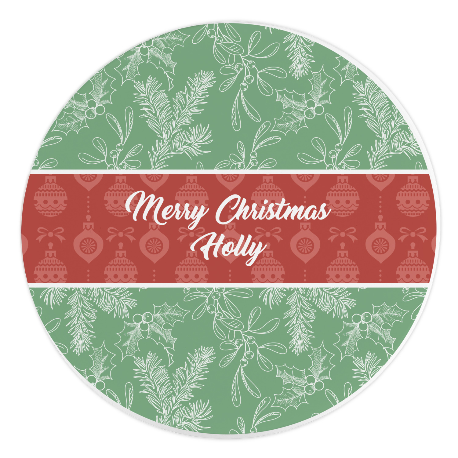 The design is divided into three horizontal parts. The top and bottom are a beautiful green holly background and the middle has a subtle red ornaments background. The middle section is where your personalization goes. This is a great design idea for Christmas decor or Christmas gifts.