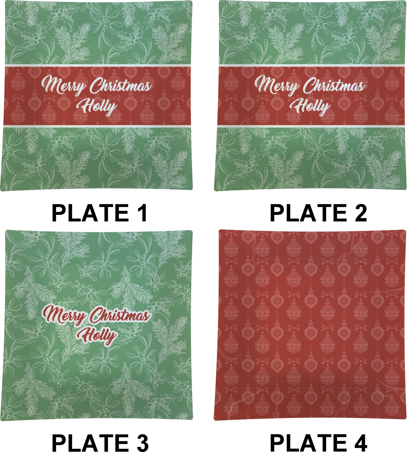 The design is divided into three horizontal parts. The top and bottom are a beautiful green holly background and the middle has a subtle red ornaments background. The middle section is where your personalization goes. This is a great design idea for Christmas decor or Christmas gifts.