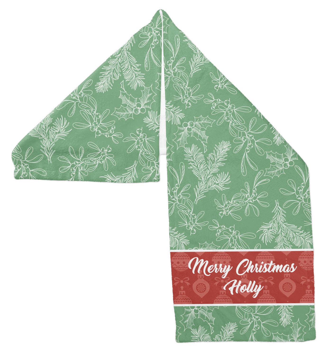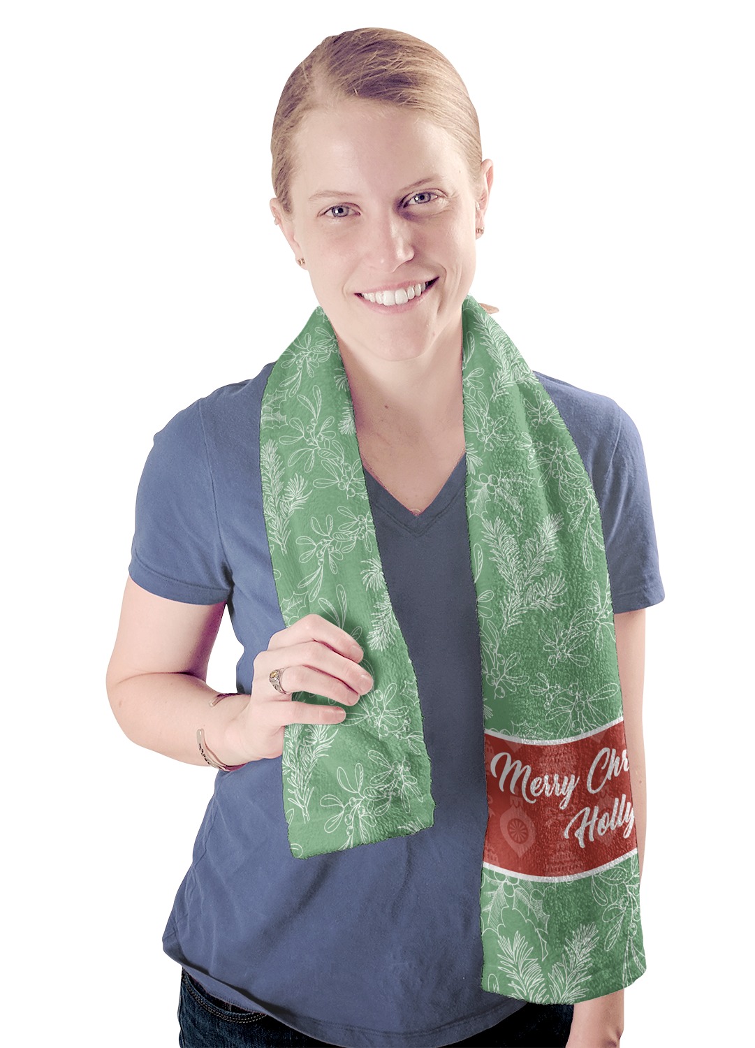 The design is divided into three horizontal parts. The top and bottom are a beautiful green holly background and the middle has a subtle red ornaments background. The middle section is where your personalization goes. This is a great design idea for Christmas decor or Christmas gifts.