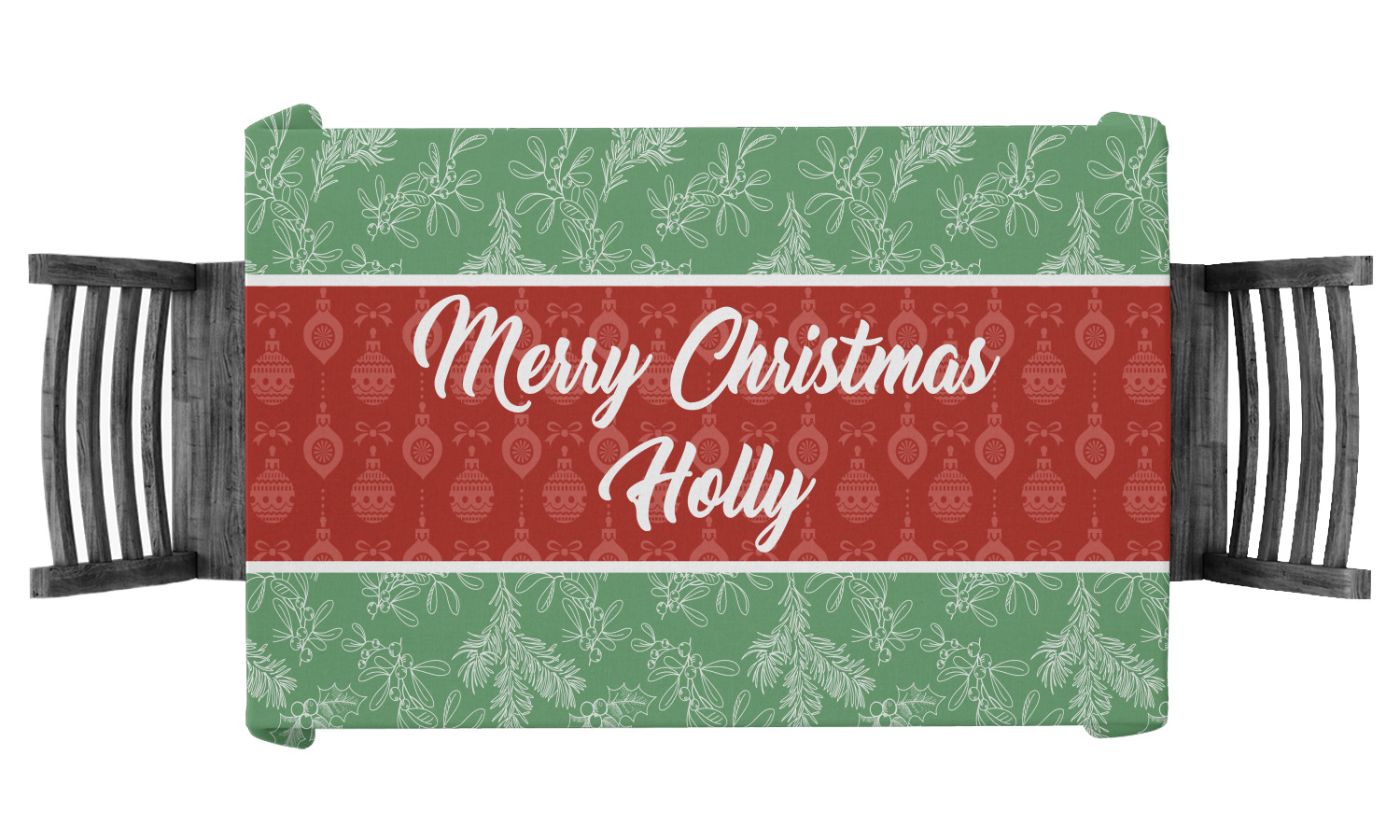 The design is divided into three horizontal parts. The top and bottom are a beautiful green holly background and the middle has a subtle red ornaments background. The middle section is where your personalization goes. This is a great design idea for Christmas decor or Christmas gifts.