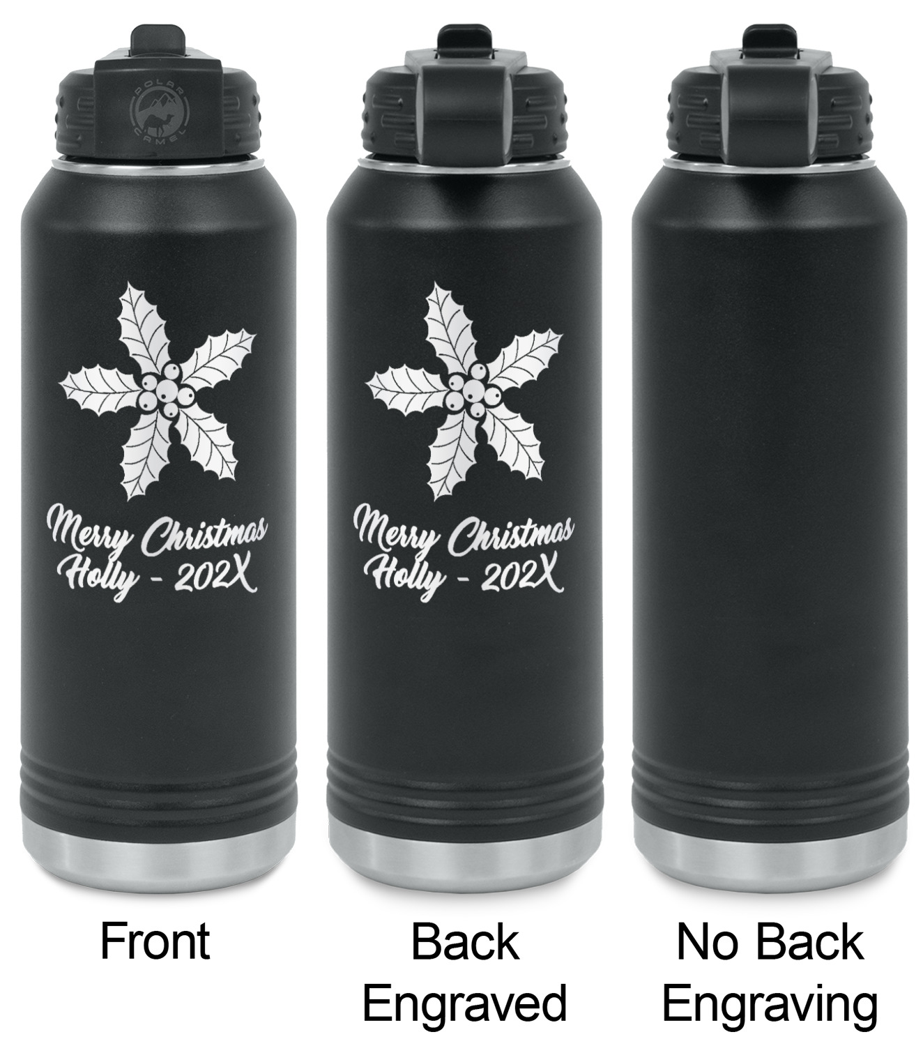 Your design is laser engraved on the water bottles. The engraving removes the black powder coating in the designed area to expose the silver stainless steel underneath.
