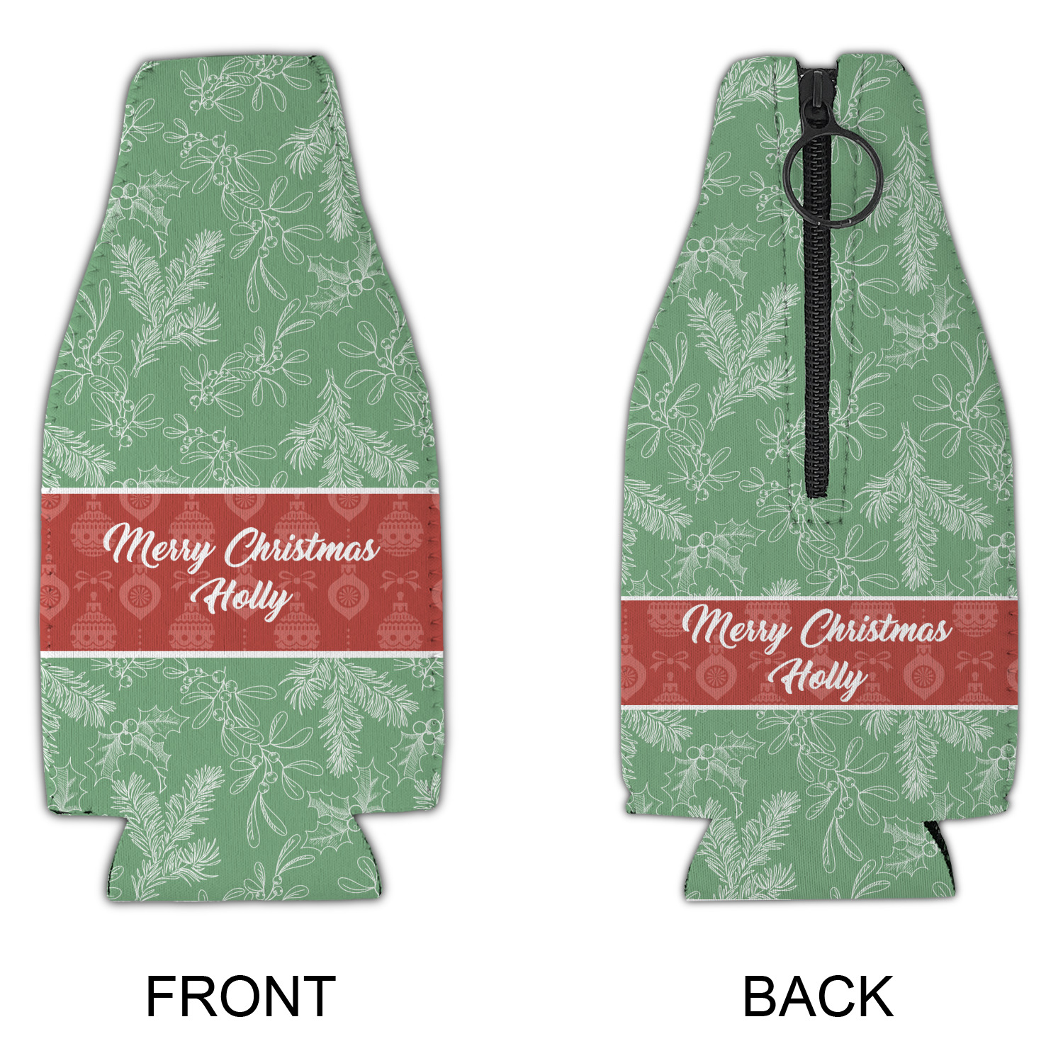 The design is divided into three horizontal parts. The top and bottom are a beautiful green holly background and the middle has a subtle red ornaments background. The middle section is where your personalization goes. This is a great design idea for Christmas decor or Christmas gifts.