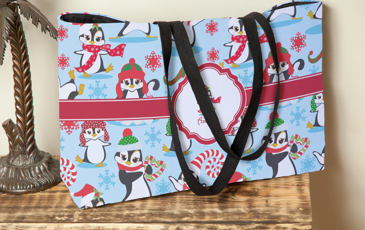 These beach totes are handmade here in the USA. Fabric is printed with your design. The tote is then sewn from the fabric pieces, lining and handles added.