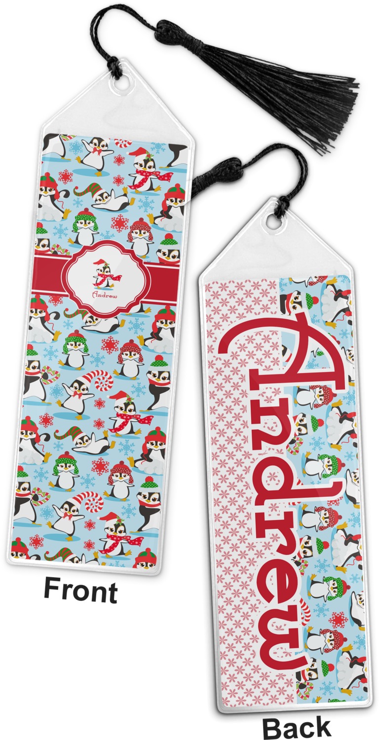 Your personalized bookmark is made of a sturdy, clear vinyl, and is approximately 7.5" x 2.25". We display your personalization on vinyl inserts that are placed on both sides. Accompanying each book marker is a black, fringe tassel that attaches to the reinforced, triangular header.