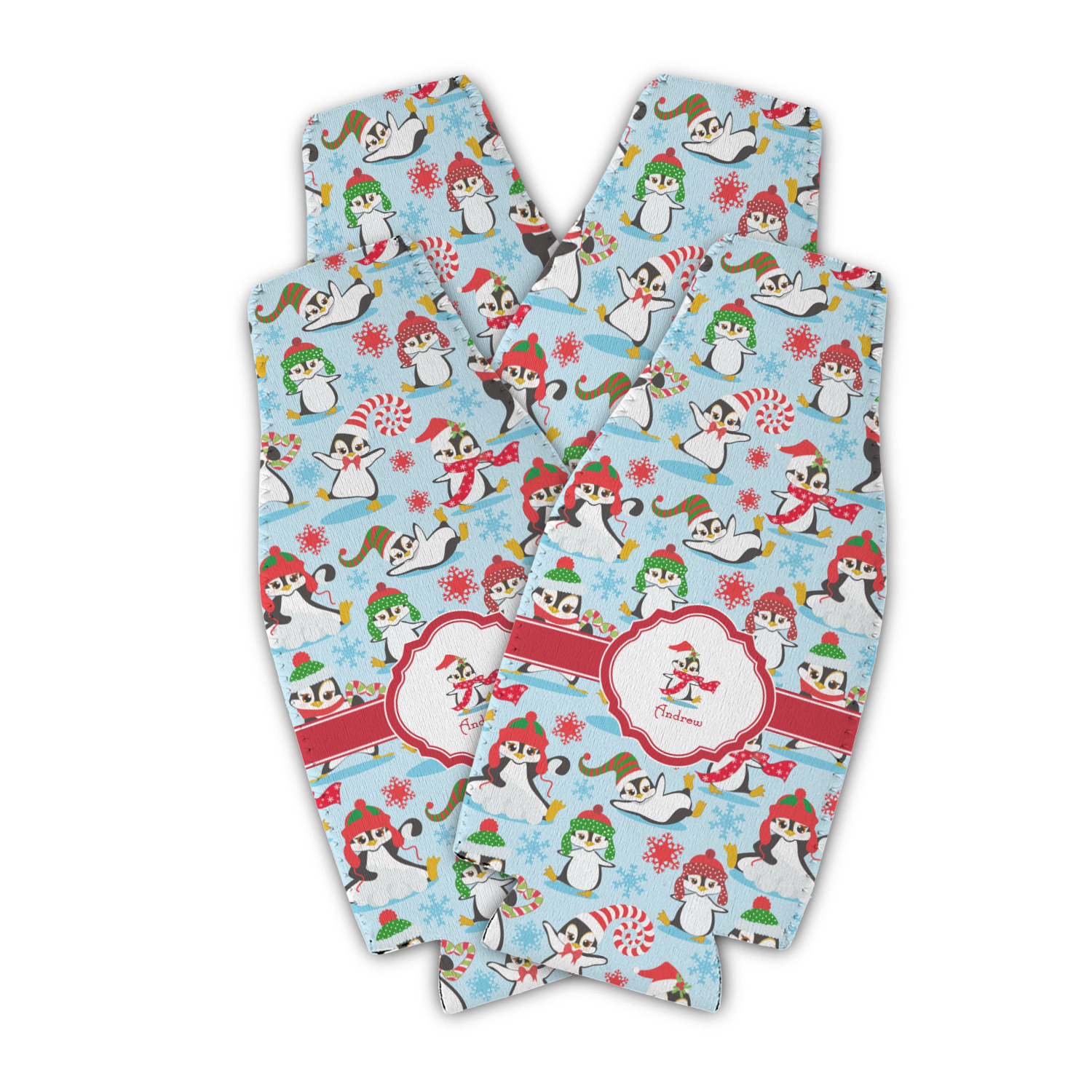 Penguins as Santa's little helpers? Everyone can agree this fun design of penguins clad in Santa hats and having a grand ole time up in the North Pole is absolutely adorable. The ribbon and label are red, and the label includes a little penguin, ready for the holidays, along with your name or text for personalization.