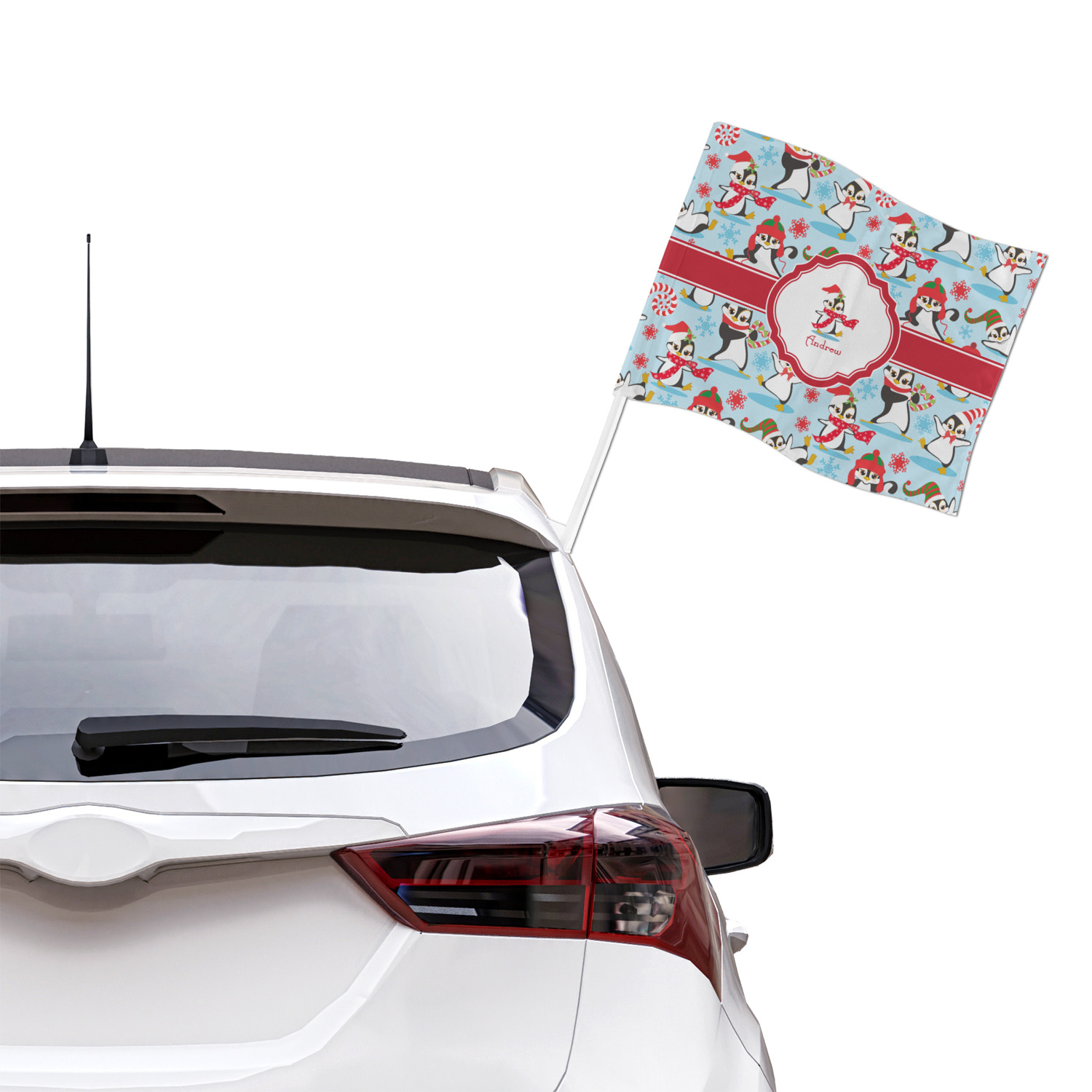 Our personalized flags are made from a durable, yet lightweight cloth that will proudly bear your logo or design of choice, while withstanding the outside elements. We have two size options - 8" x 11" and 11" x 15". Both come with a flag pole which includes a clip that secures the pole to the side window, whether it is rolled up or down. The flags are printed on both sides to display your design from all directions.