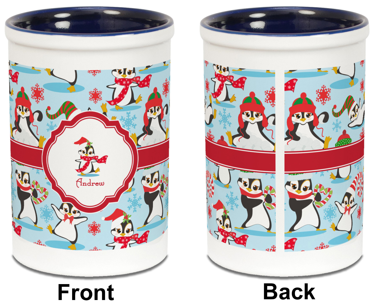 Both the blue and black pencil holders are a ceramic material, giving you a sturdy and long-lasting pen and pencil holder. We print your designs on the exterior of the pencil cup, covering most of the outside surface. There is a small white border on the top and bottom of the exterior of the pen holder, setting apart your design from the interior's color. Our ceramic pen caddy is roughly 3.5" x 3.5" x 5" in dimensions.