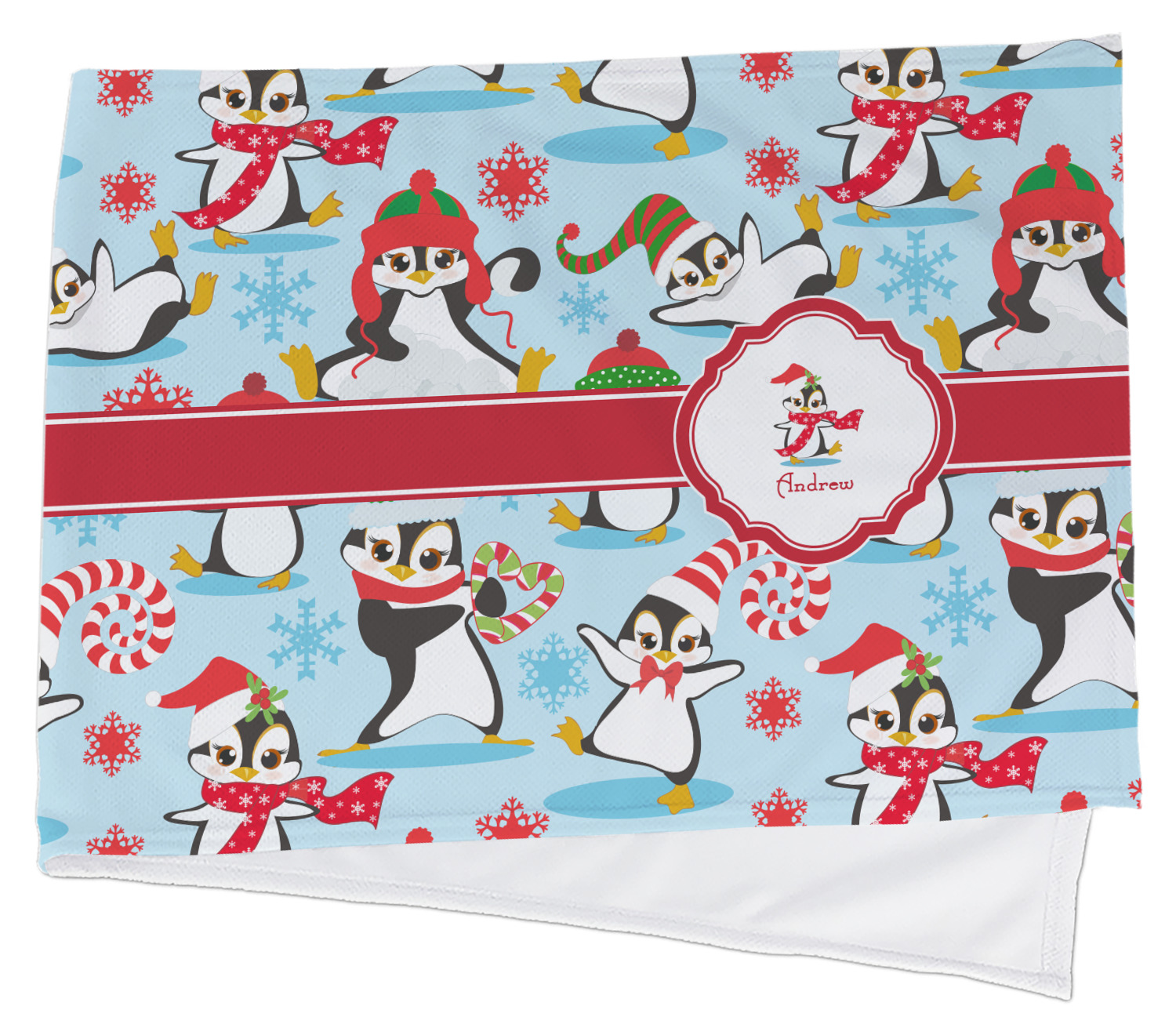 Penguins as Santa's little helpers? Everyone can agree this fun design of penguins clad in Santa hats and having a grand ole time up in the North Pole is absolutely adorable. The ribbon and label are red, and the label includes a little penguin, ready for the holidays, along with your name or text for personalization.