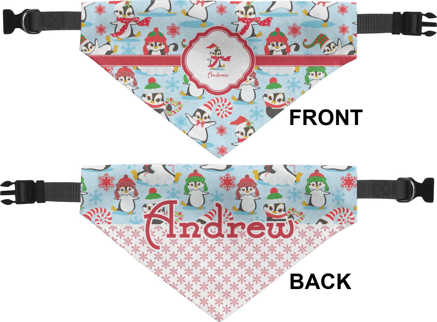 We print the front and back of these dog bandanas with your customized design. The bandana itself is made from a durable polyester, sewn together with a gap large enough to accommodate any collar. Regardless, the bandana includes a plain black, canvas collar with plastic snaps, that can easily be removed if desired. These dog bandana collars are available in four sizes: small, medium, large, and extra large. Please see our sizing chart for more information regarding the dimensions of each size.