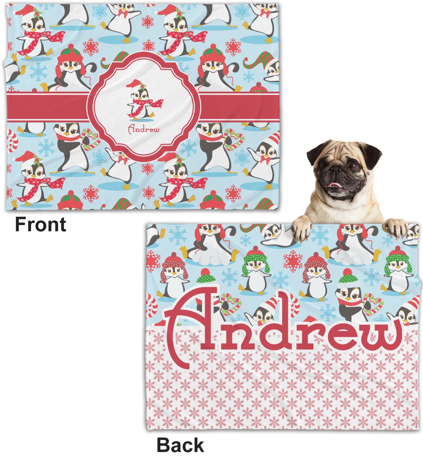 These dog blankets are crafted from a gentle, soft-to-the-touch, minky material. We print your customizations, either matching or differing, on both the top and underside of the blanket. These personalized dog blankets are available in two sizes: regular and large. Our regular size, at 40" x 30", accommodates small and some medium size dogs. At 60" x 50", our large dog blanket is a better fit for bigger breeds. Though specialized for dogs, these blankets still make a thoughtful gift for your favorite feline, or any other pet in mind!