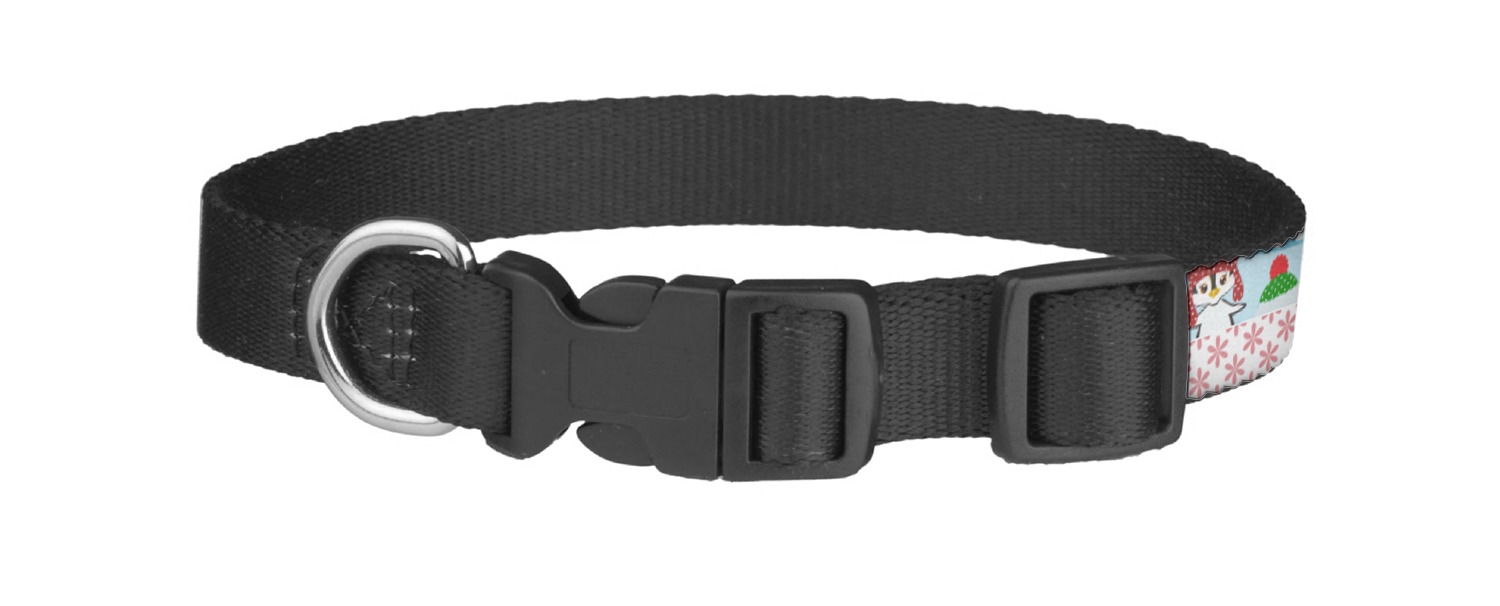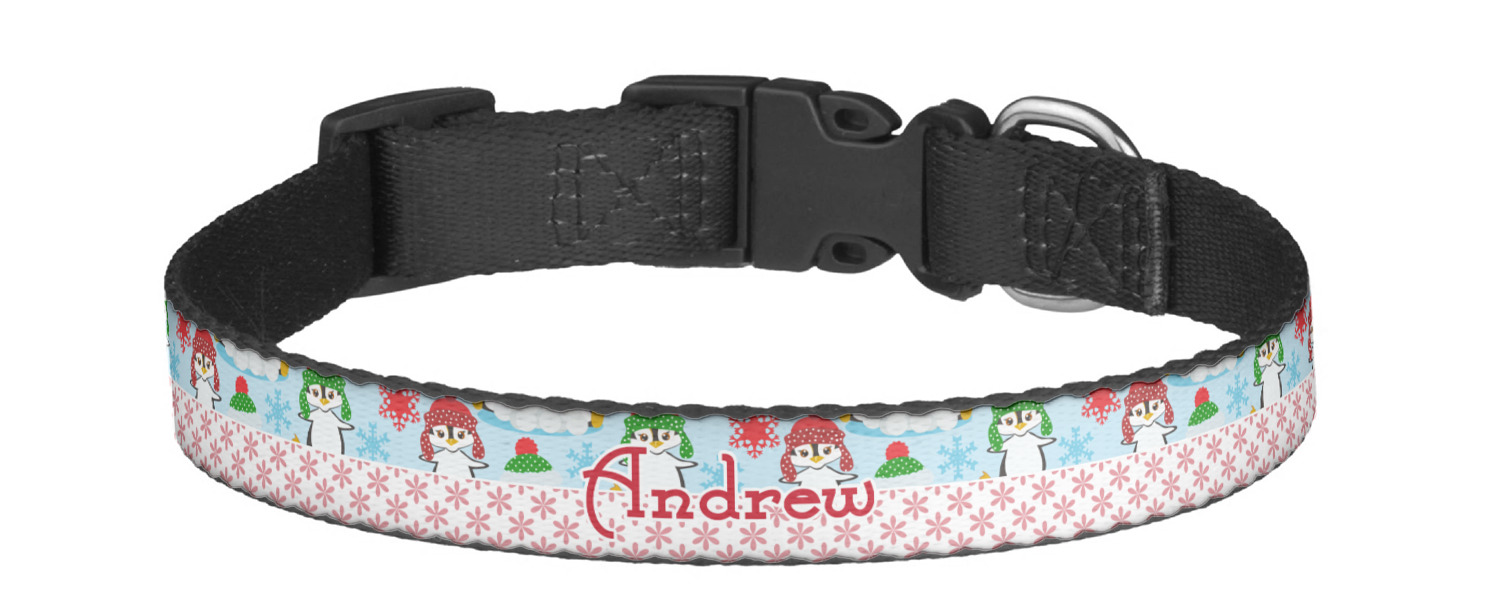 This sturdy collar, made from a durable nylon weave, will outlive your dog's episodes of excited tugging and pulling. Courtesy of its thick plastic buckle and adjuster, this collar is adjustable and accommodating of any dog. Structurally, the collar is a single piece of nylon weave that is sewn together, and features a solid metal loop where you can attach a leash or dog tag. We print and display your dog's name and pattern across the middle of the personalized dog collar.