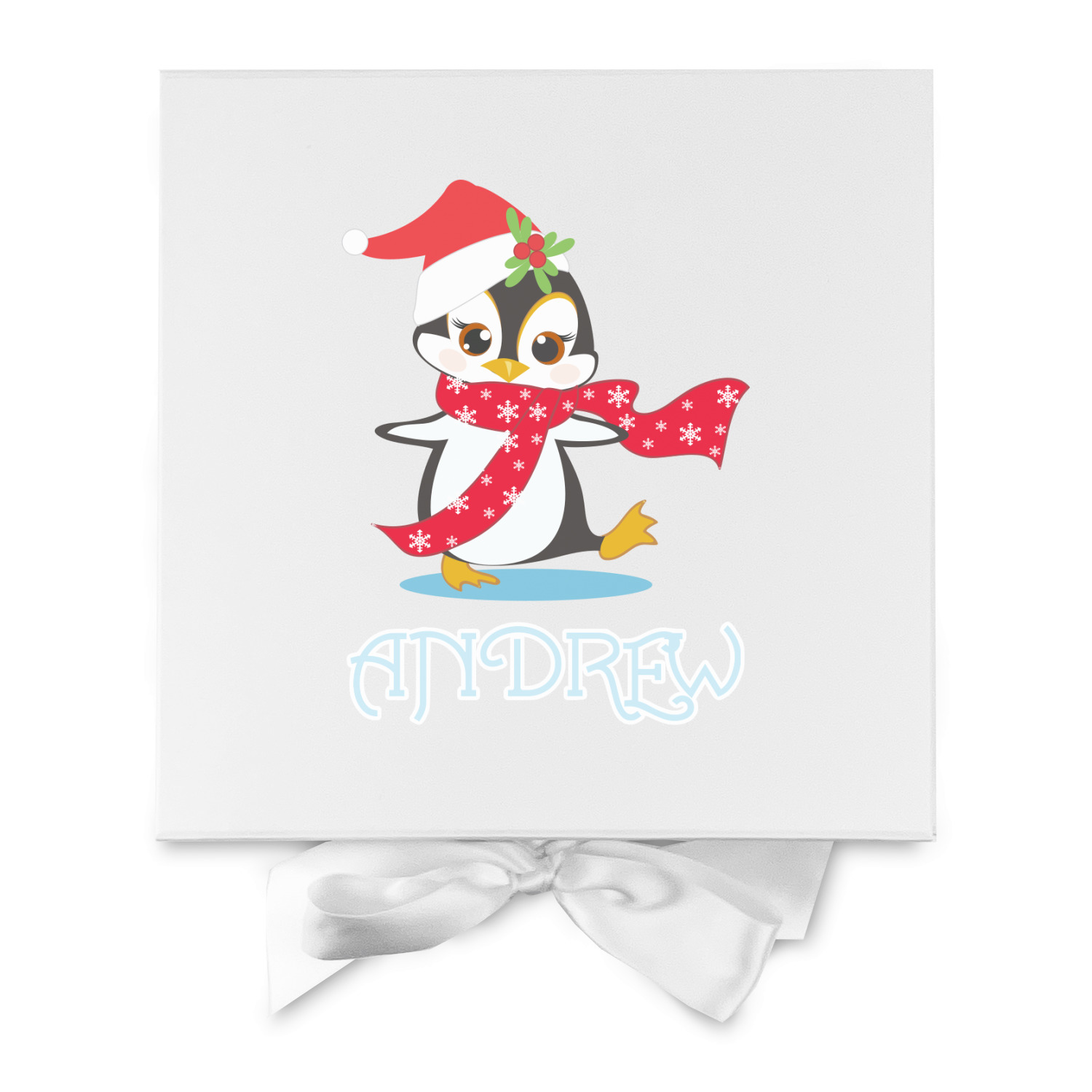 Penguins as Santa's little helpers? Everyone can agree this fun design of penguins clad in Santa hats and having a grand ole time up in the North Pole is absolutely adorable. The ribbon and label are red, and the label includes a little penguin, ready for the holidays, along with your name or text for personalization.