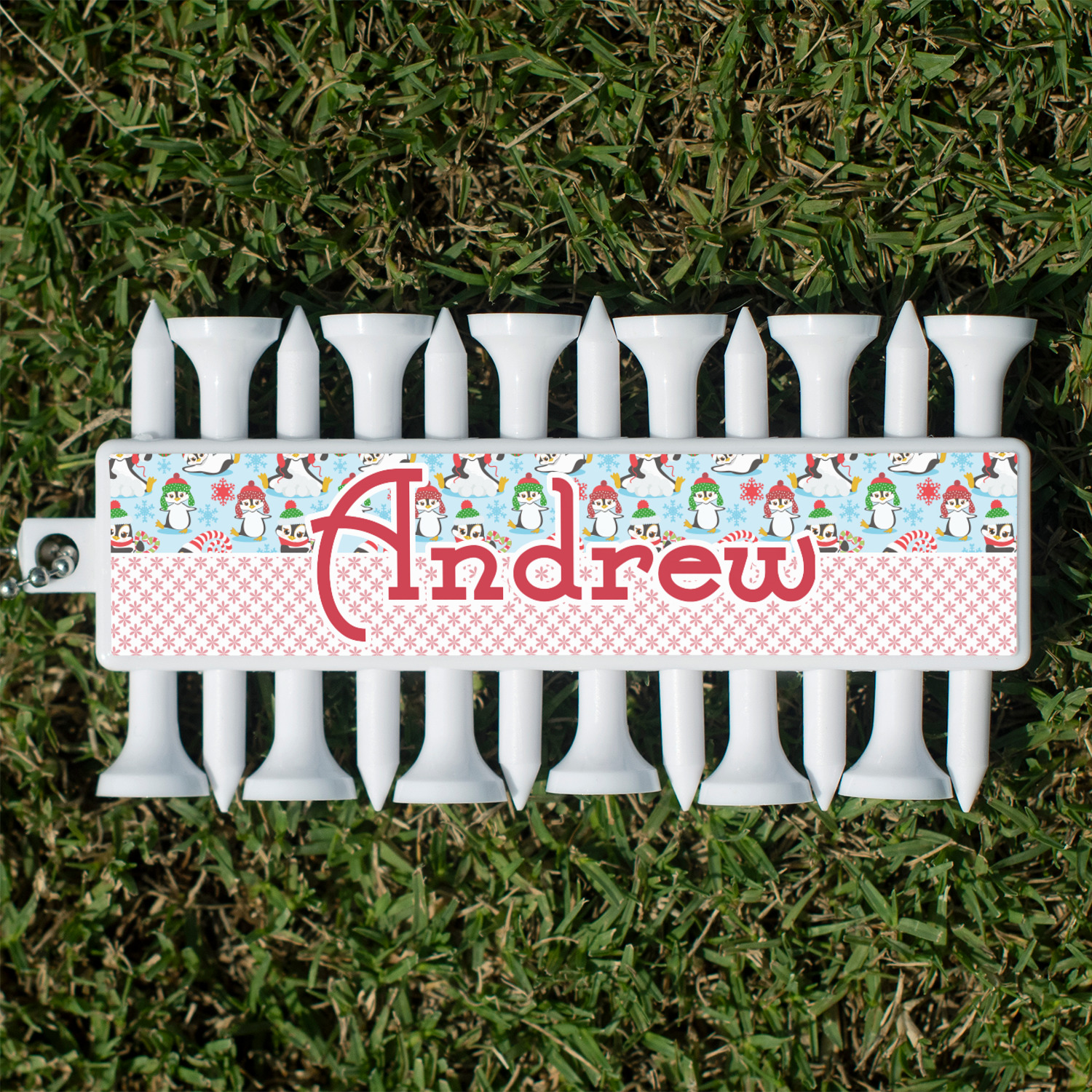 With 12 tees on a lightweight, portable key chain, it almost ensures a great 18 holes. Our tees are made of white plastic and are a little over 2". Design the front and the back of the golf tee holder. Pick from over a hundred designs, colors, and personalization styles! The set even comes with three removable ball markers as well!