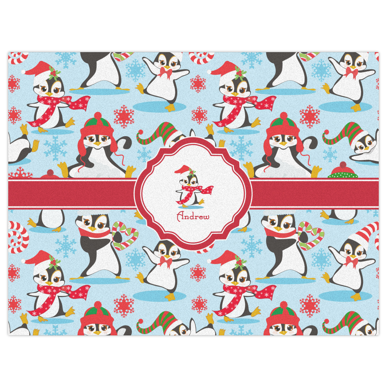Penguins as Santa's little helpers? Everyone can agree this fun design of penguins clad in Santa hats and having a grand ole time up in the North Pole is absolutely adorable. The ribbon and label are red, and the label includes a little penguin, ready for the holidays, along with your name or text for personalization.