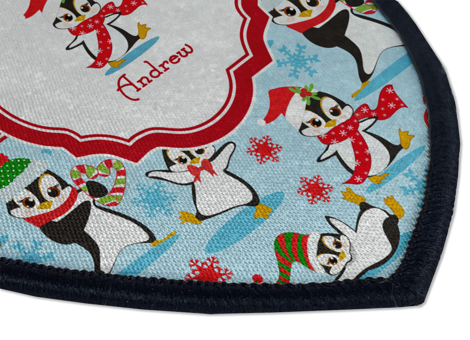 Penguins as Santa's little helpers? Everyone can agree this fun design of penguins clad in Santa hats and having a grand ole time up in the North Pole is absolutely adorable. The ribbon and label are red, and the label includes a little penguin, ready for the holidays, along with your name or text for personalization.