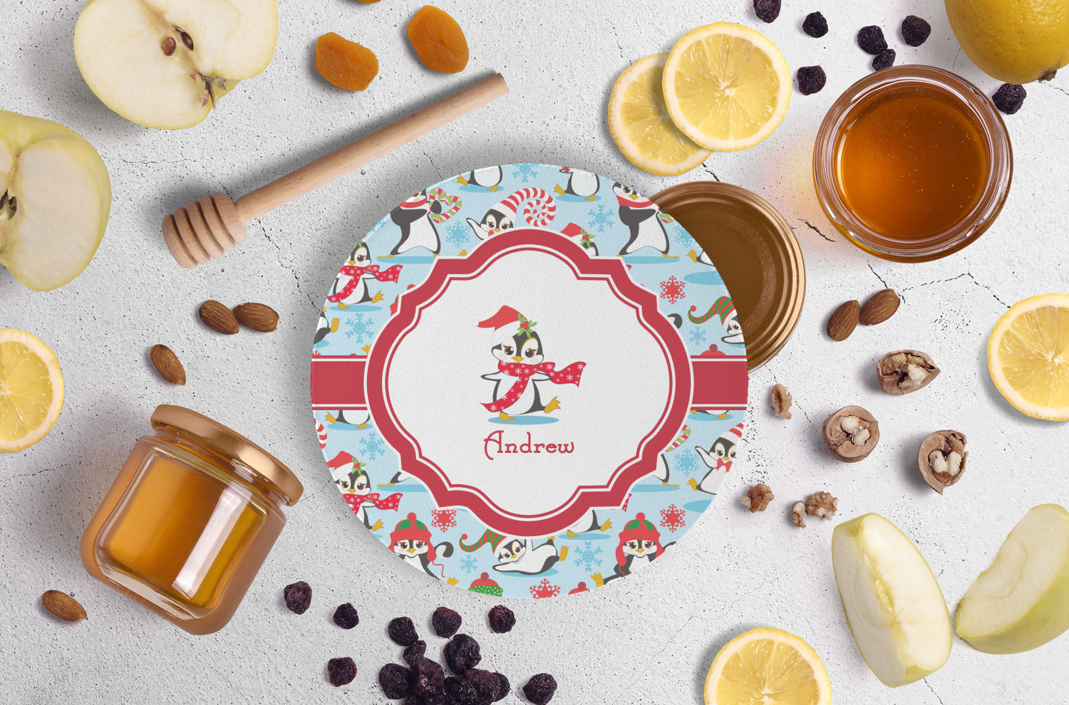 Penguins as Santa's little helpers? Everyone can agree this fun design of penguins clad in Santa hats and having a grand ole time up in the North Pole is absolutely adorable. The ribbon and label are red, and the label includes a little penguin, ready for the holidays, along with your name or text for personalization.