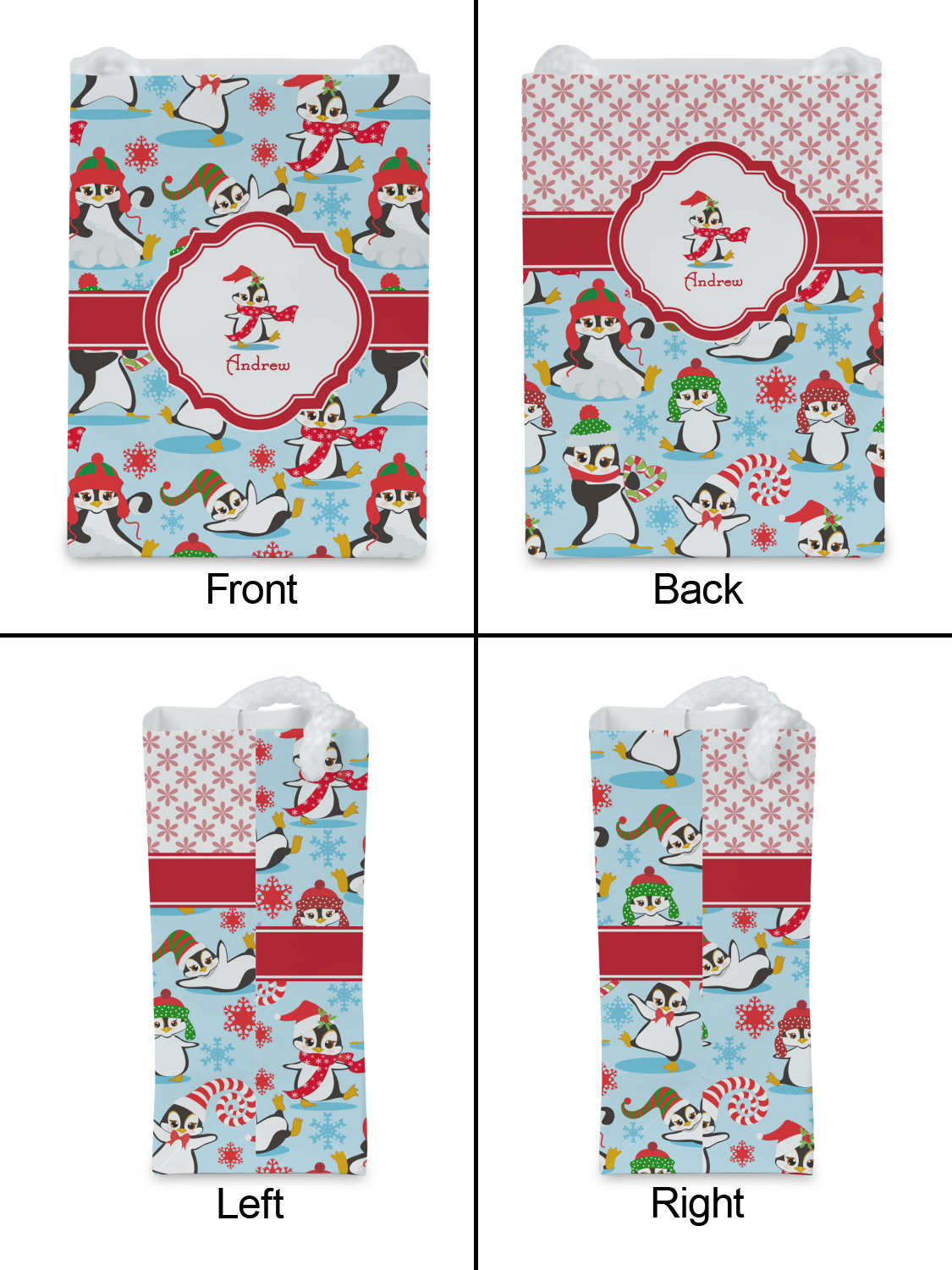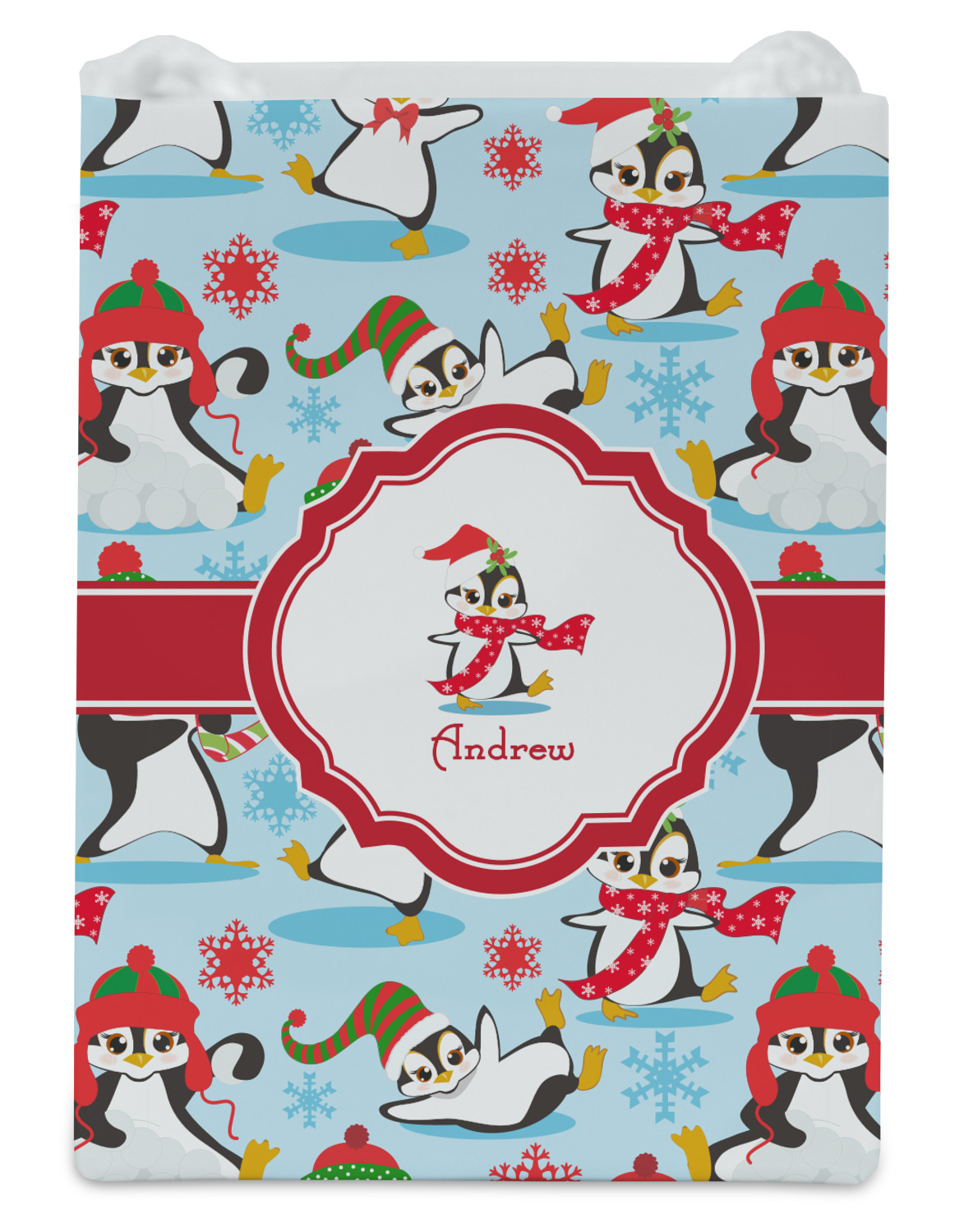 Penguins as Santa's little helpers? Everyone can agree this fun design of penguins clad in Santa hats and having a grand ole time up in the North Pole is absolutely adorable. The ribbon and label are red, and the label includes a little penguin, ready for the holidays, along with your name or text for personalization.