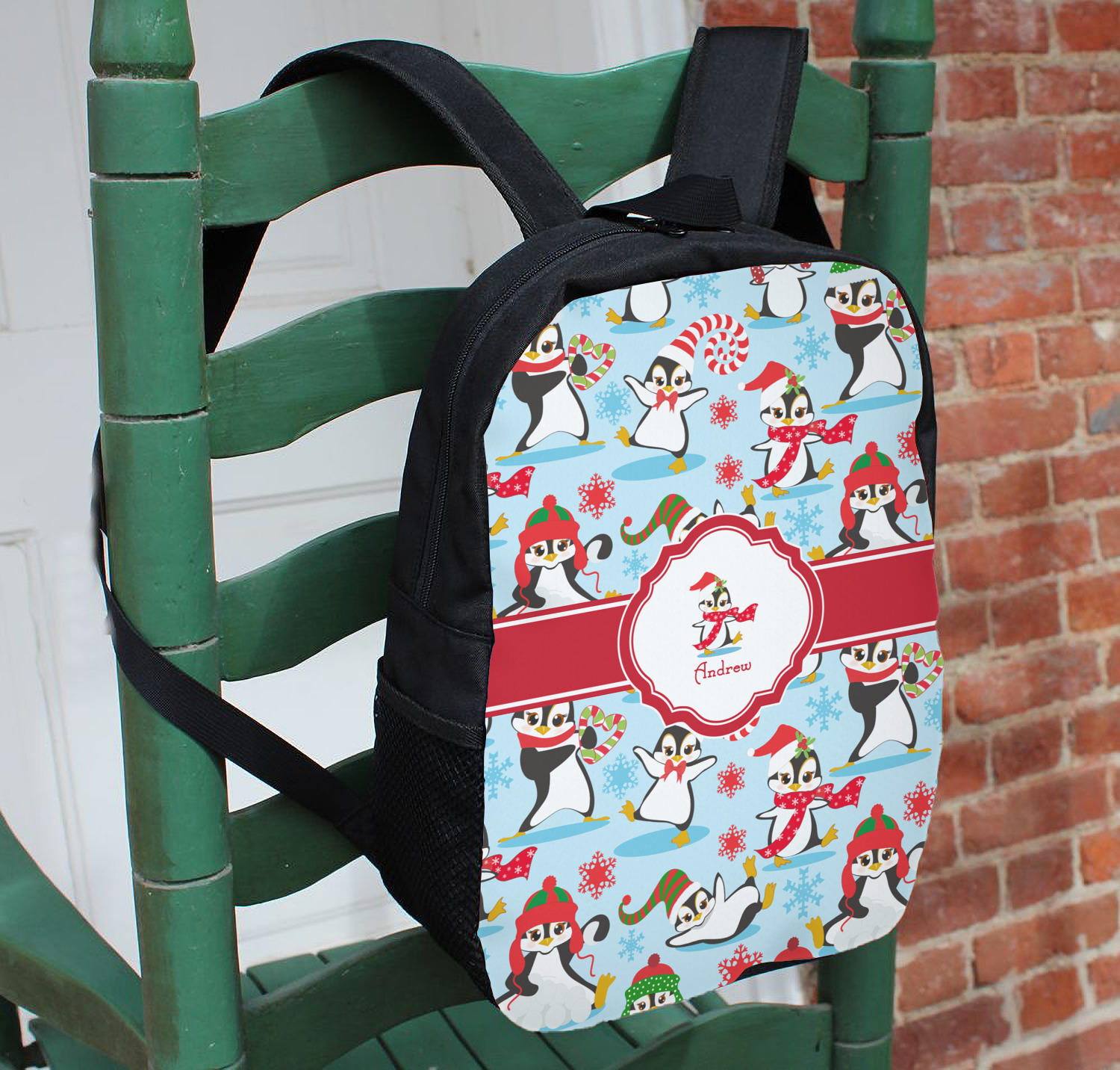 These small backpacks are made of a durable black canvas material with your personalization right on the front. The two shoulder straps are padded and easily adjustable. The bag itself measures at about 11" W x 15" H x 5" D. It's the perfect size for elementary aged kids or adults who want a smaller backpack. On the top of the bag you will find a handle to hang or carry your backpack by as well as a large zipper closure to keep all of your belongings safe inside. On each side of your backpack is a mesh pocket for a small item or water bottle. Inside your backpack you will find a spacious area with a small zipper pocket and a padded laptop slot that will fit up to a 13" laptop (13" being very snug). This is the perfect bag for any student that needs a couple books and their laptop with them at all times. It also works great as a carry on for traveling!