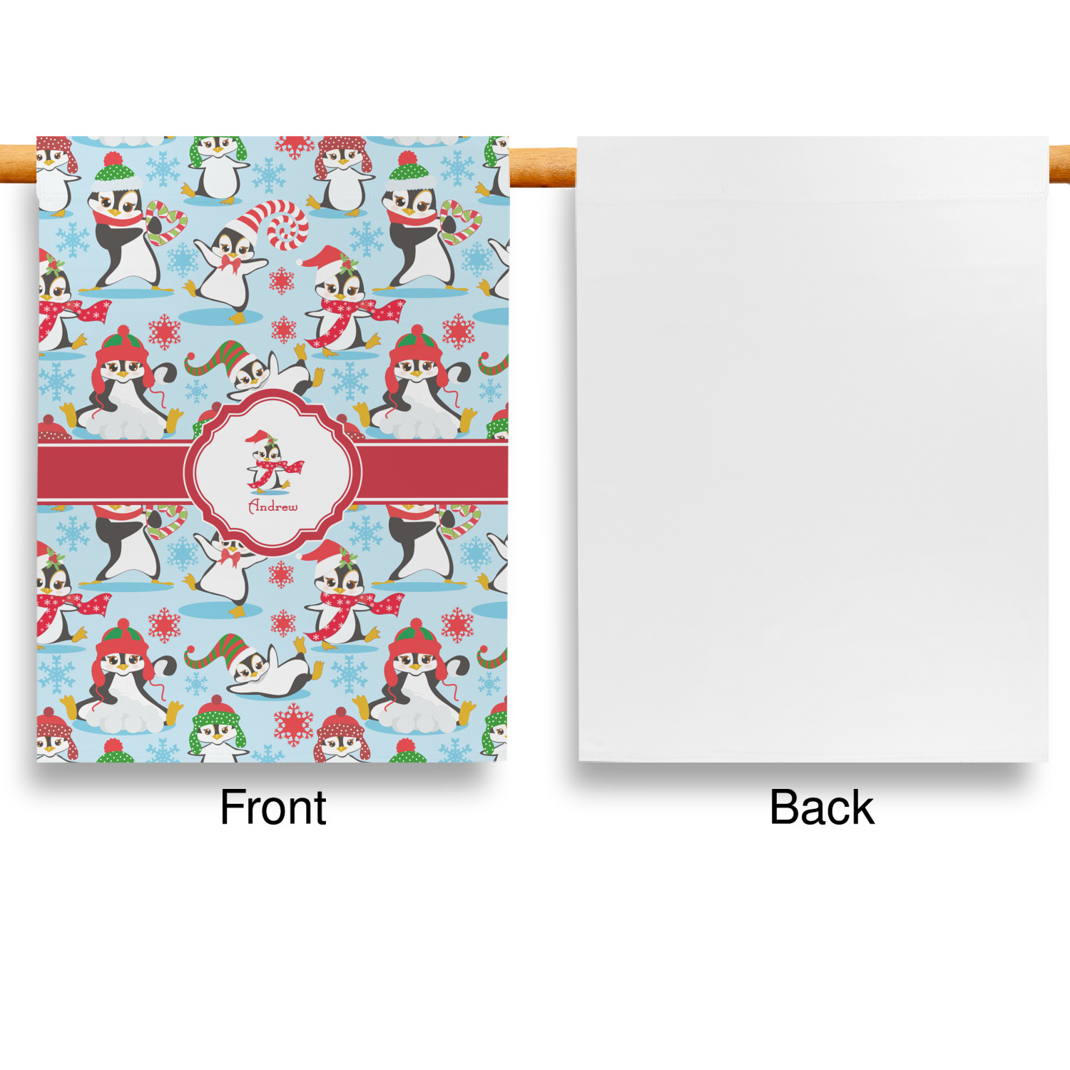 These custom garden flags are made of a durable, double-ply, polyester weave, allowing them to withstand the elements year round. The small flags measure at approximately 12 by 18 inches. The large flags measure out to 28 by 37 inches. You can order these decorative flags with your customization printed on the front only, or the front and back.