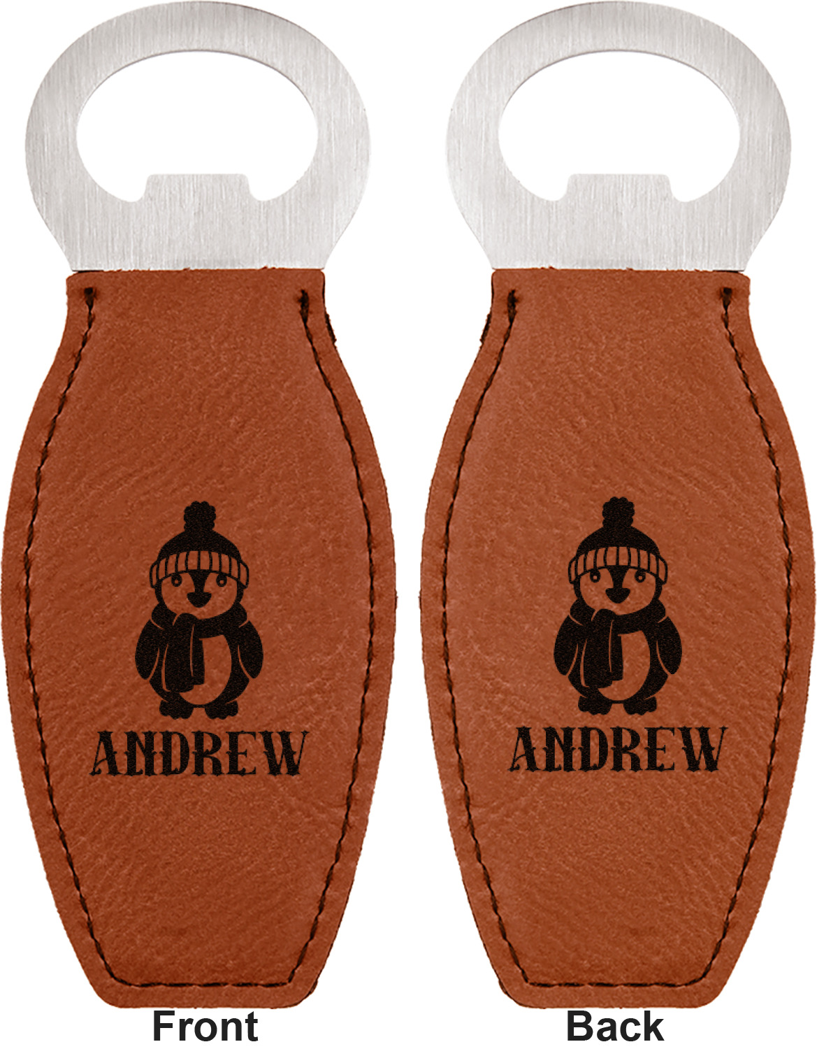 Built from stainless steel, these custom bottle openers are wrapped in a cognac-colored leatherette. Sharp, black stitching lines the edges for extra durability and a finished touch. Your personalization is laser-engraved onto the surface of this leatherette, leaving behind a crisp, black coloration. At 4.6 by 1.8 inches, this beer bottle opener gives you much of leverage when trying to open a stubborn bottle. On the opposite end of the opener, you'll find a magnet that you can use to display your new, unique bottle opener!