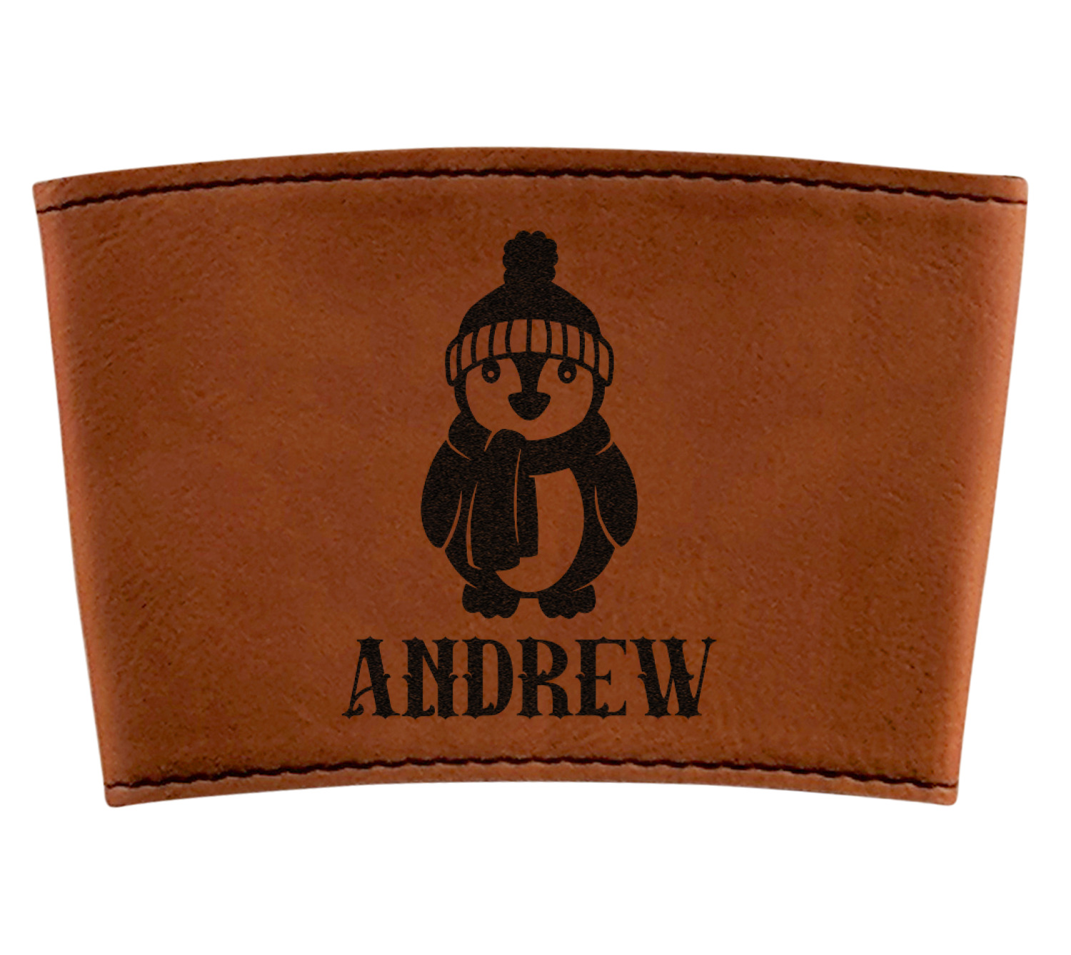 This cup sleeve is made from a suave, cognac-brown leatherette and finished with an intricate, black stitch. The interior of this can sleeve is fabricated from a thin foam material to help insulate your mug's contents. The sleeve is specifically made to suit tapered glasses or mugs, so the top's diameter is 3.5 inches, while the bottom's diameter is 2.75 inches. Your customized design will be laser engraved into the leatherette, leaving behind crisp, black imprint. With these products, we provide you with the option of engraving the front and back, or the front only.