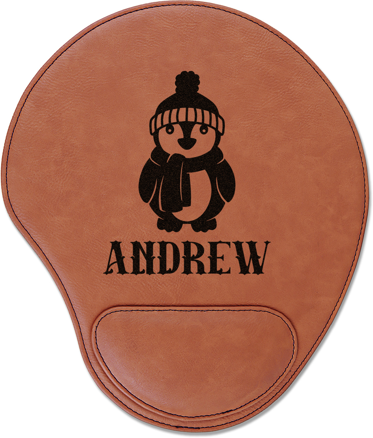 In a rounded shape, this mouse pad is made of a luxurious, cognac-colored leatherette. The nature of this material allows your mouse to glide smoothly across its surface. Strong stitching lines the edges to guarantee stability and strength. As added support for tired wrists, your personalized mouse pad features a supportive wrist rest at its bottom. This model measures at 10.25" x 9", while its wrist pad is approximately 5" x 2.75", with a thickness of 0.75". Your personalized design is laser engraved into the front face of this mouse pad.