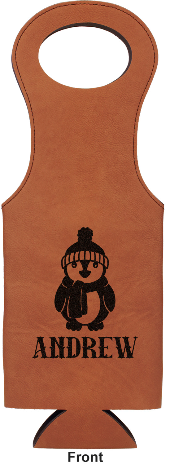 This wine carrier is made from a stunning leatherette, in a cognac-brown color. Strong, black stitching lines the sides of your wine bottle bag and provides extra durability. The interior is lined with a padded, black material to allow for a snug fit once your bottle is placed inside. At the top of this wine gift bag, you'll find two oval shaped handles that elegantly complements the rest of the bag's style. We provide you with the option of laser-engraving the front, or the front and back of your new personalized wine bag!