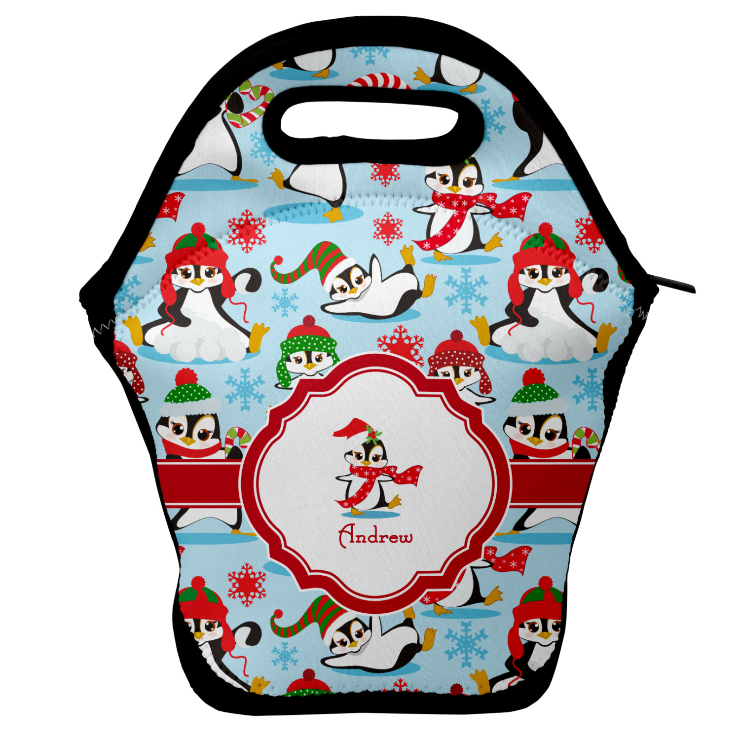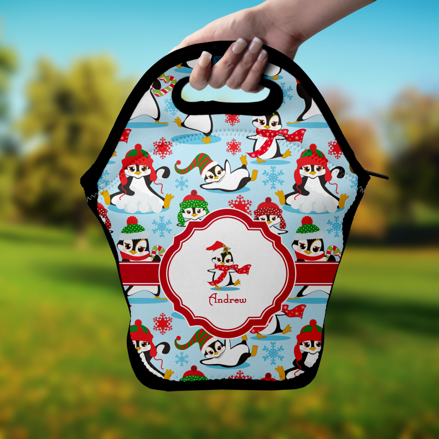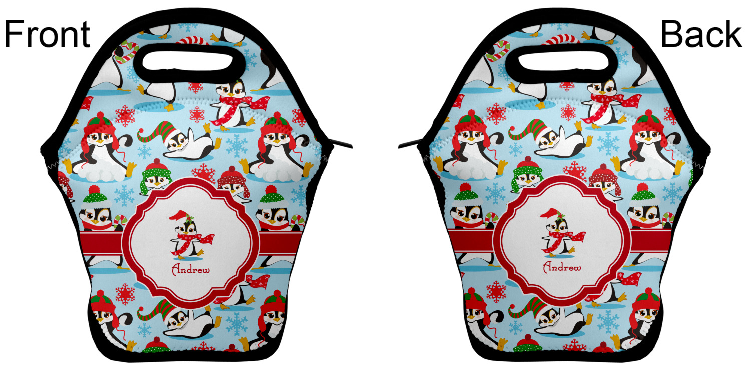 Our personalized lunch bags are made from a strong neoprene, and secure with a zipper closure that lines the top of the bag.The edges of the neoprene are sewn together with a heavy duty stitch, adding to the durability of the bag. The is accompanied by a reinforced handle at its top, for the easy transport of your lunch. We display your personalization across both the front and back of this neoprene lunch bag, while the remaining sides are a sleek black in color. Each bag measures at 13.5 inches tall, and 11.5 inches wide.