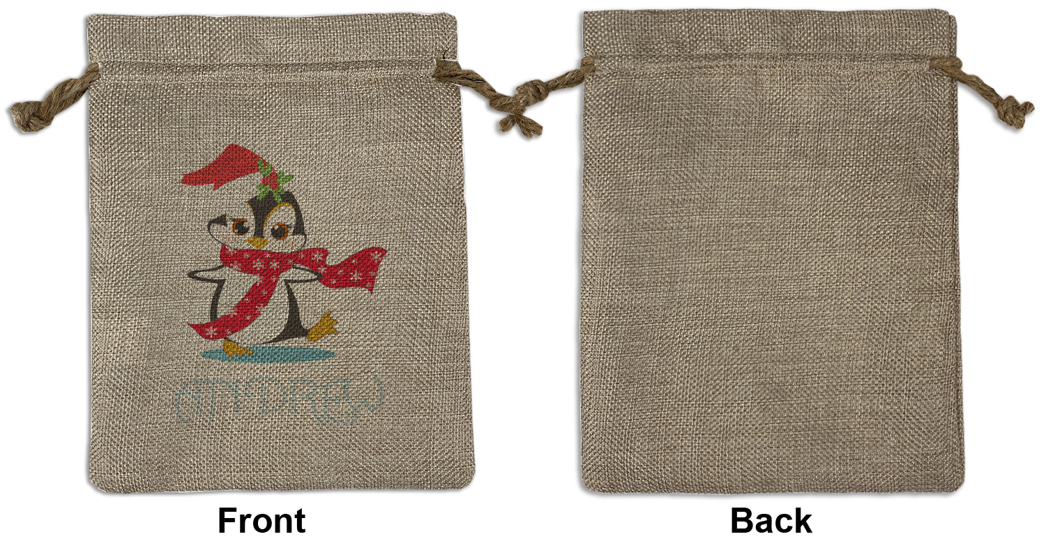 We sell our Burlap Gift Bags in 3 variant sized bags. Made with burlap polyester, each personalized bag can be secured with a twine drawstring pull. Your custom design is available to print on one side or both sides - completely up to you! The sizes of the bags measure approximately 4.5" x 6.5" for the smallest size, 6.5" x 8.0" for the medium size, and 6.5" x 13.5" for the large-sized bag.
