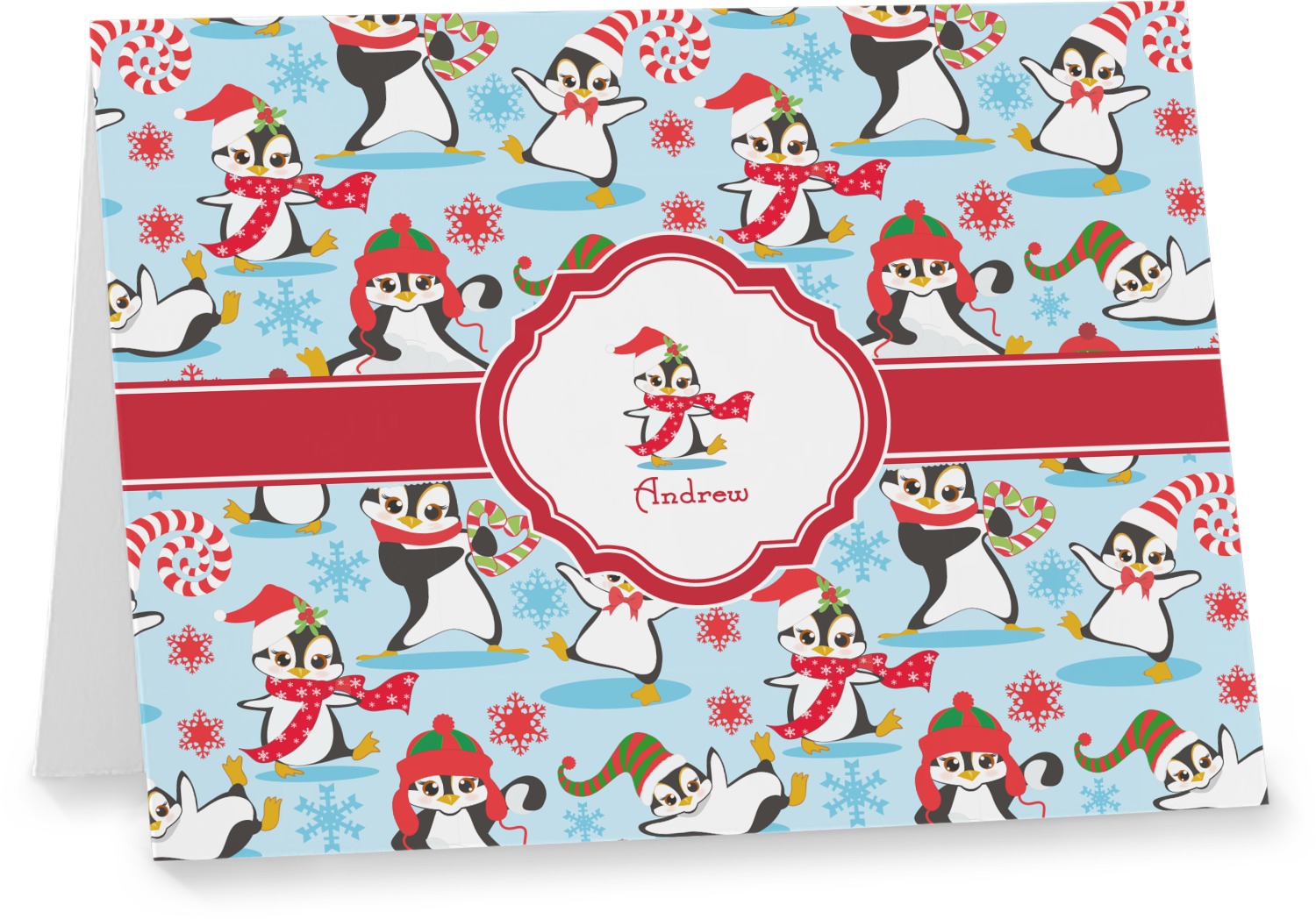 Penguins as Santa's little helpers? Everyone can agree this fun design of penguins clad in Santa hats and having a grand ole time up in the North Pole is absolutely adorable. The ribbon and label are red, and the label includes a little penguin, ready for the holidays, along with your name or text for personalization.