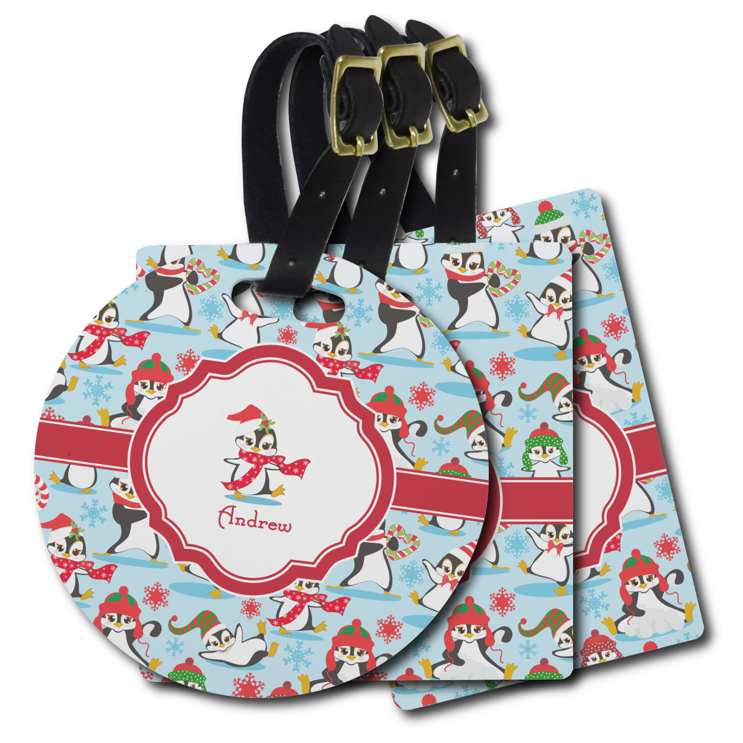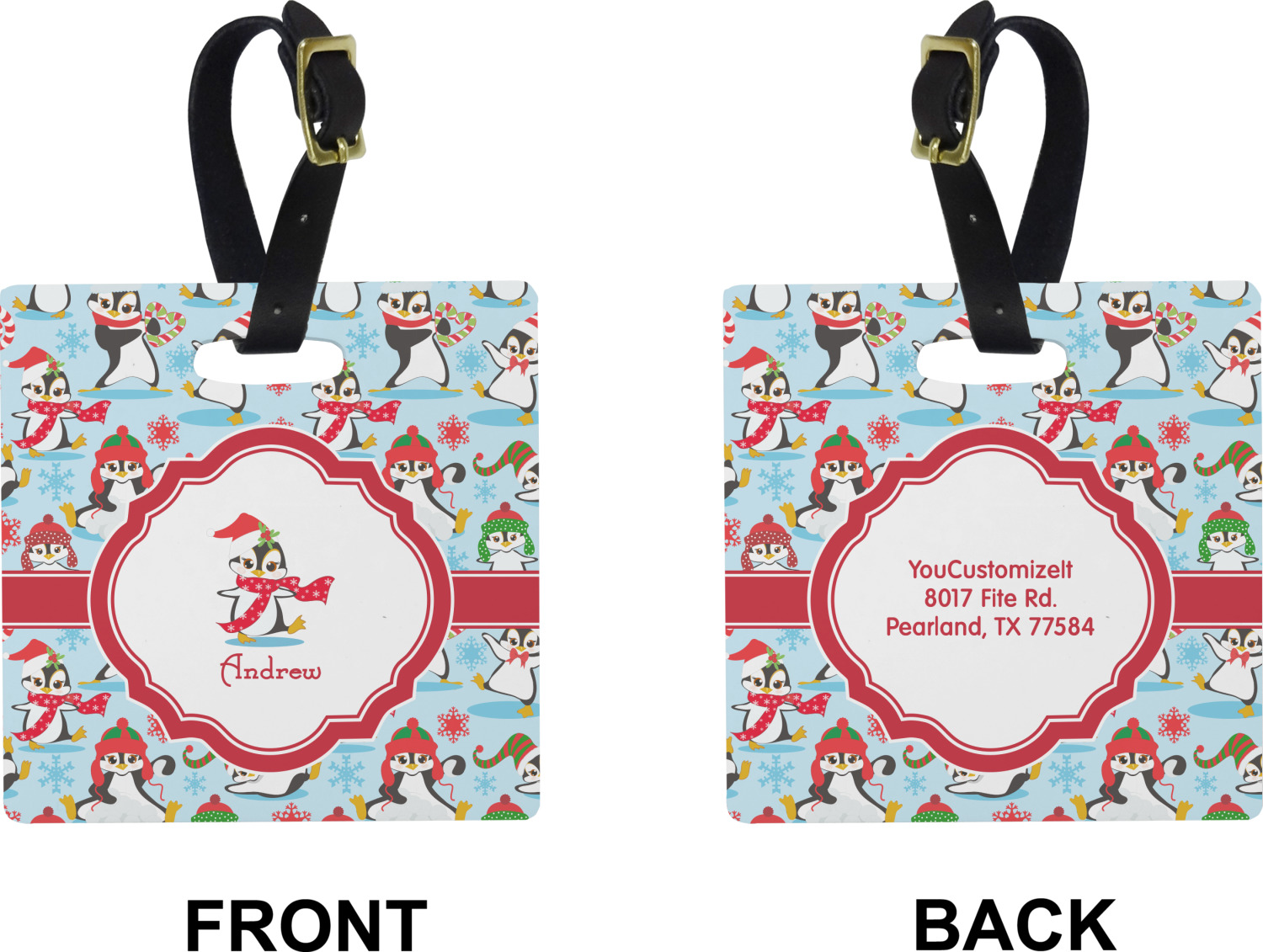 These personalized bag tags are sold in a variety of shapes, so that you may find the product that meets your vision exactly. We sell a round luggage tag, which measures at approximately 4" x 4". Our square luggage tag is about 3.5" x 3.5", while our rectangular version is 2.75" x 4 ".
