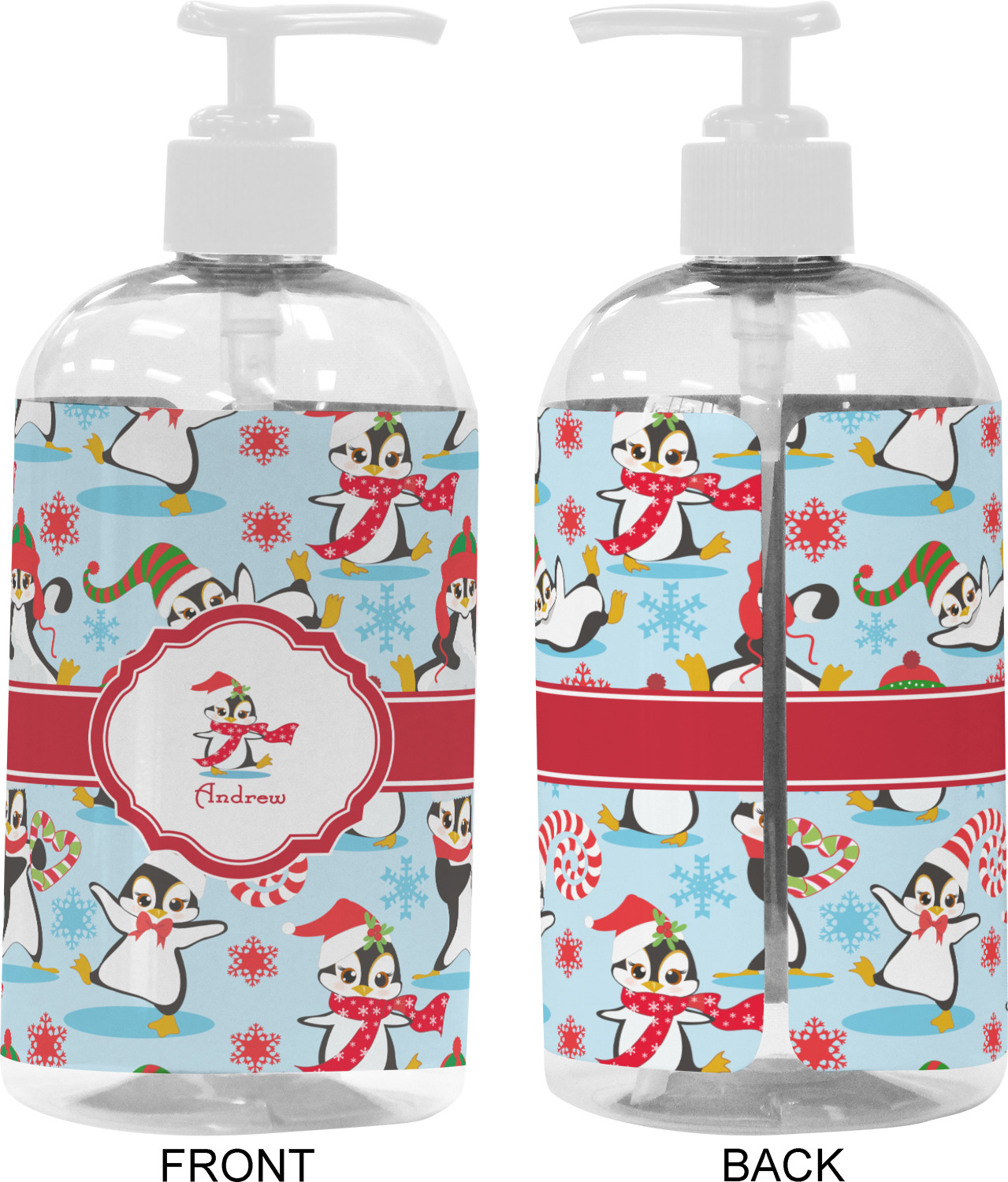 Penguins as Santa's little helpers? Everyone can agree this fun design of penguins clad in Santa hats and having a grand ole time up in the North Pole is absolutely adorable. The ribbon and label are red, and the label includes a little penguin, ready for the holidays, along with your name or text for personalization.