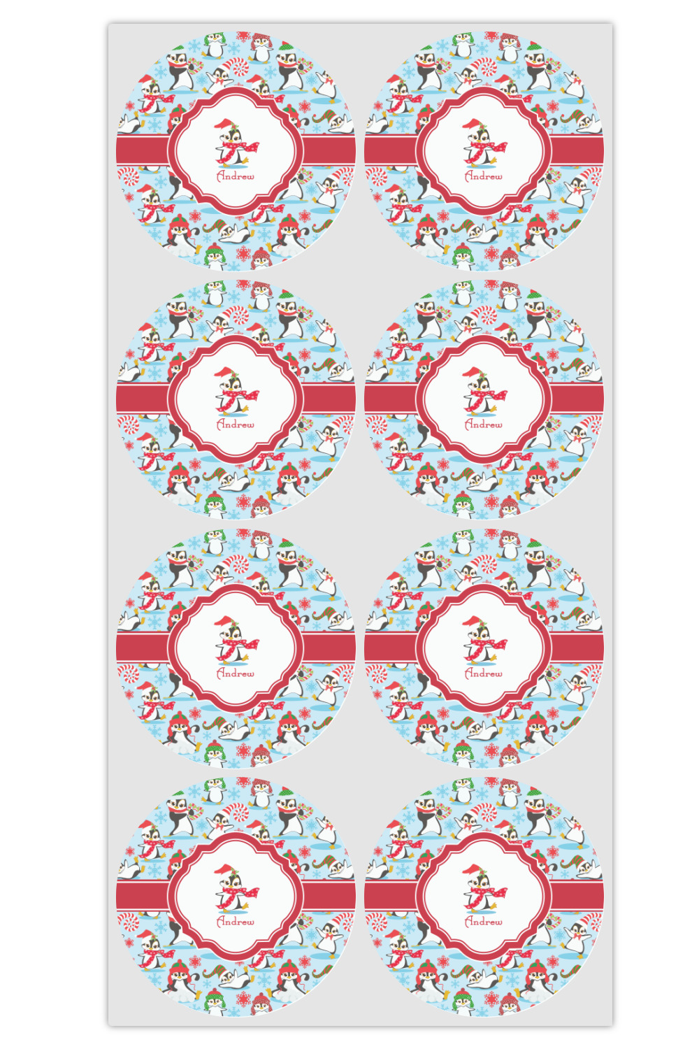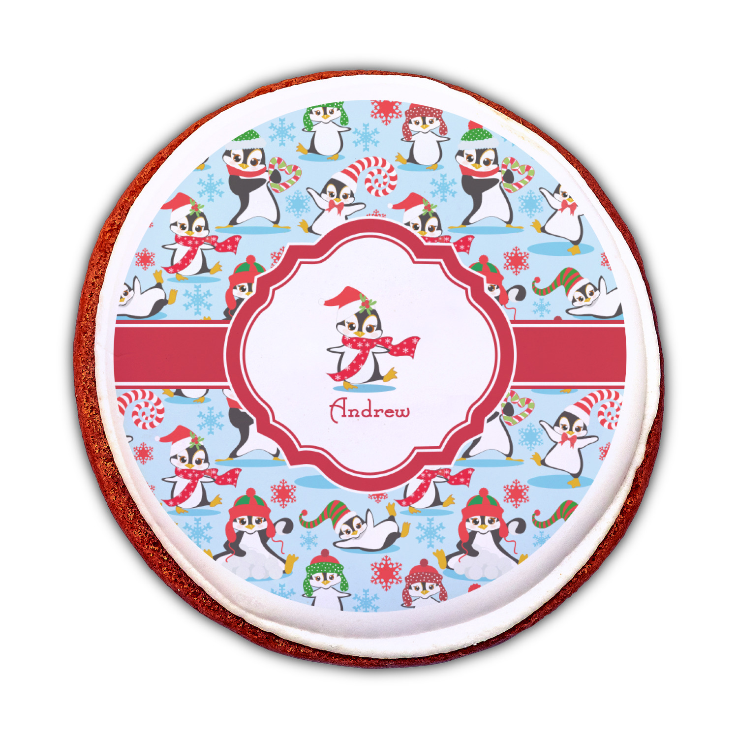 Penguins as Santa's little helpers? Everyone can agree this fun design of penguins clad in Santa hats and having a grand ole time up in the North Pole is absolutely adorable. The ribbon and label are red, and the label includes a little penguin, ready for the holidays, along with your name or text for personalization.
