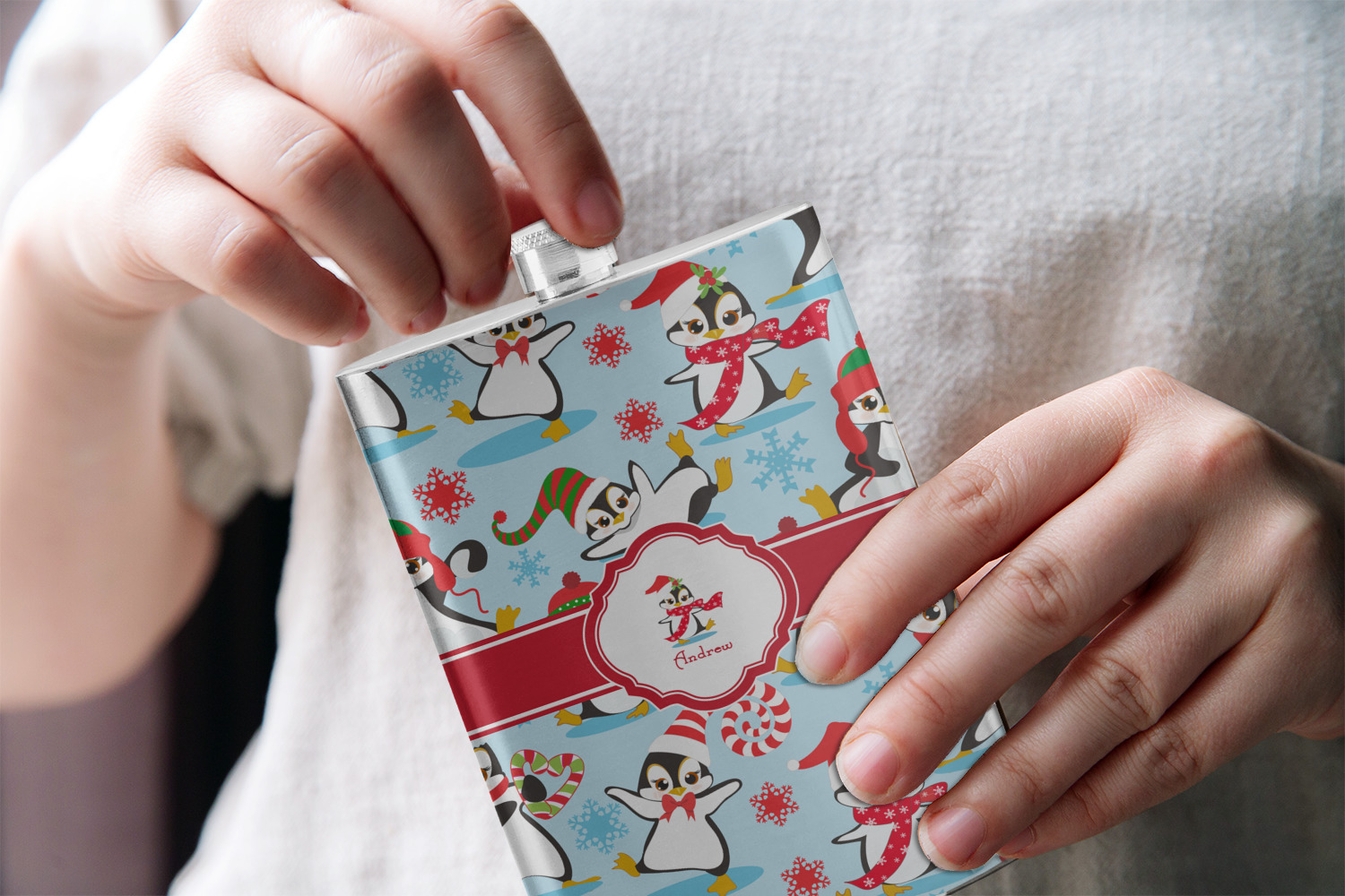 Penguins as Santa's little helpers? Everyone can agree this fun design of penguins clad in Santa hats and having a grand ole time up in the North Pole is absolutely adorable. The ribbon and label are red, and the label includes a little penguin, ready for the holidays, along with your name or text for personalization.