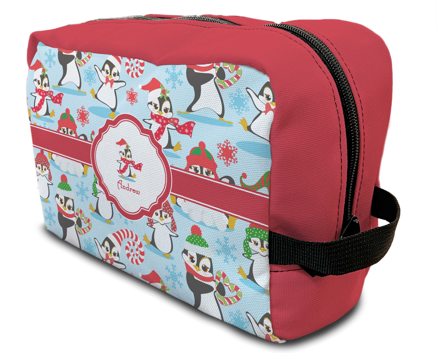 Our toiletry bag has the traditional dopp kit design i.e. a side to side zippered closure, giving you easy access to all the contents inside and a sturdy handle on one side of the bag. The canvas fabric for dopp kits is printed, then cut and sewn here in the USA.