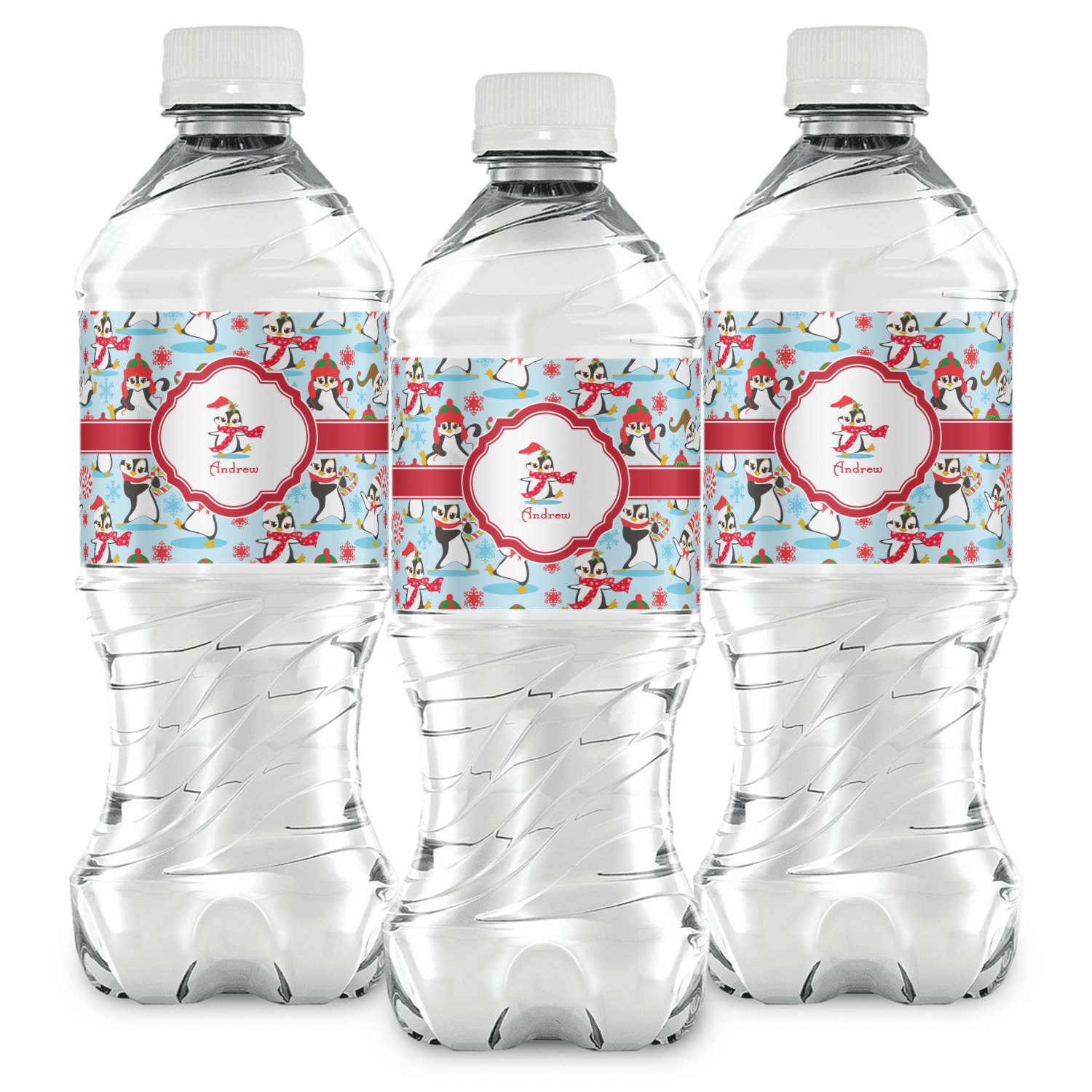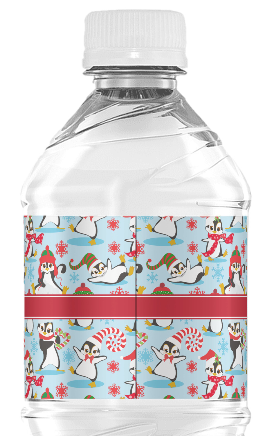 Penguins as Santa's little helpers? Everyone can agree this fun design of penguins clad in Santa hats and having a grand ole time up in the North Pole is absolutely adorable. The ribbon and label are red, and the label includes a little penguin, ready for the holidays, along with your name or text for personalization.