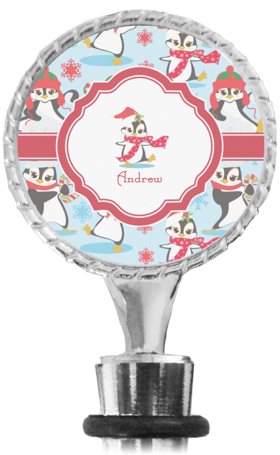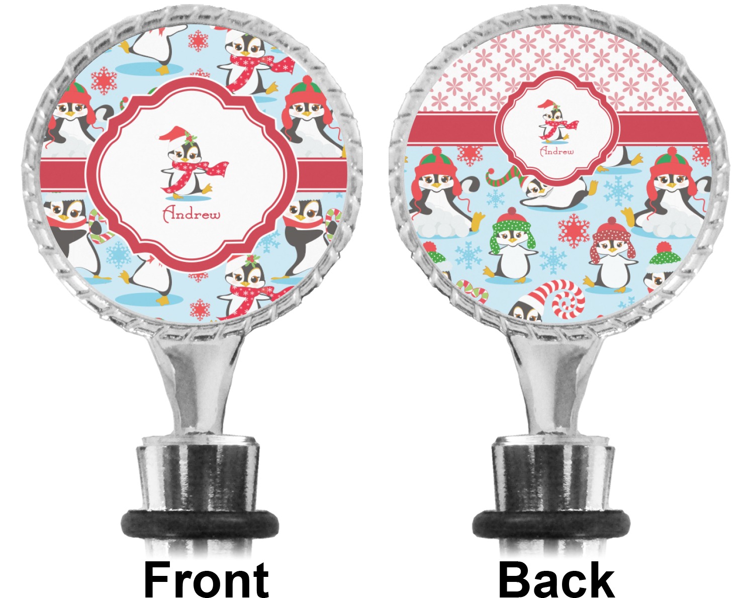 The top part of your bottle stopper is comprised of a zinc ring that displays your customization(s) in its middle, on both sides. The ring is heavy duty, with a bright chrome finish. The body of the wine stoppers have two silicone rings to provide an airtight seal. These wine bottle stoppers measure at 1.625" L x 0.8125" W x 4.625" H; your custom wine stopper is meant to fit into most standard-sized wine bottles.